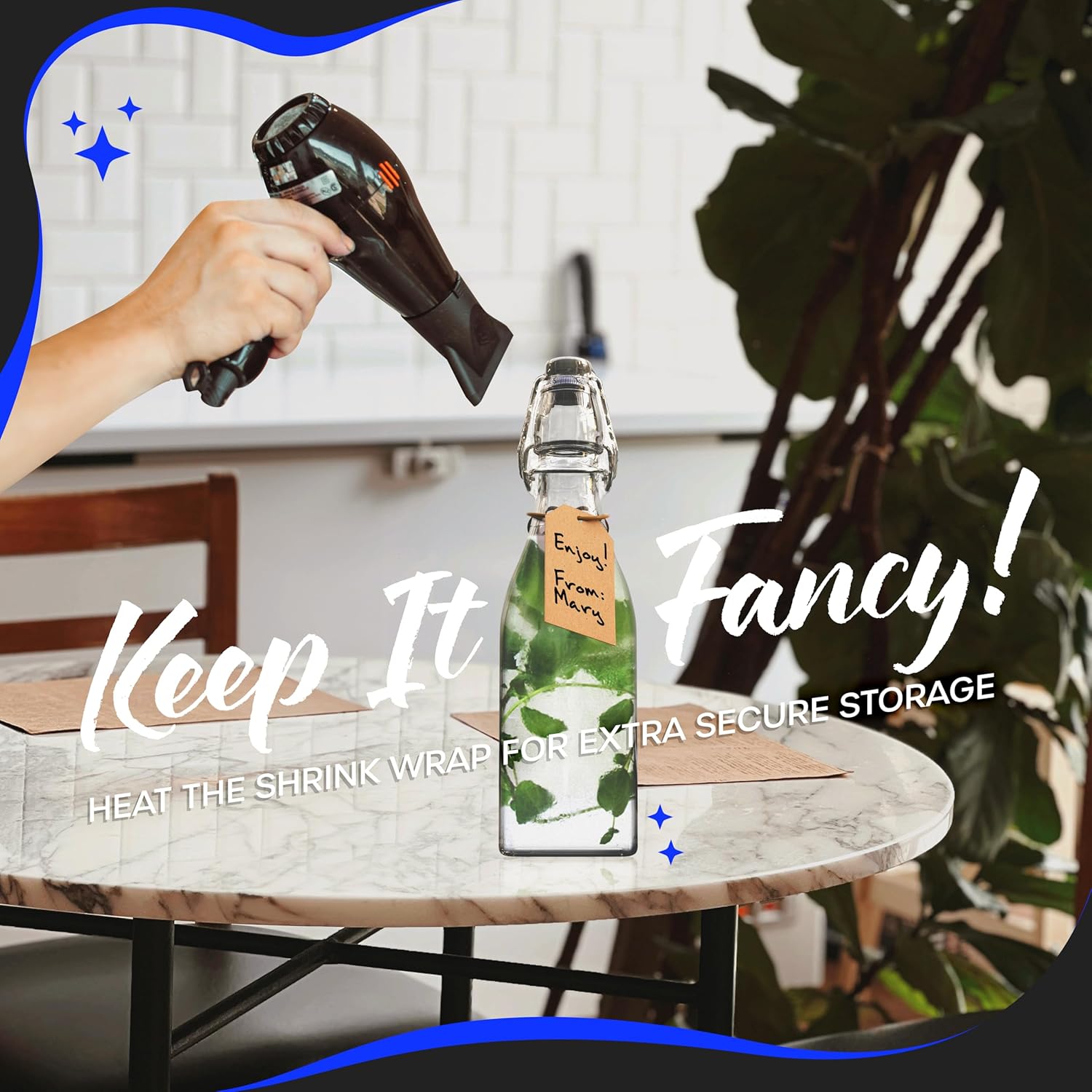- Comprehensive Glass Bottles with Airtight Lid Set: Enhance your bottling endeavors with 12 stunning glass juice bottles with lids , a funnel, a bottle brush, a glass marker, 15 shrink wrap pieces (3"x4") & 15 tags (1.5"x2.75") with strings. Curated with both form & function in mind, this complete glass water bottle stopper bundle gives you everything you need to store, clean & personalize your favorite beverages. Perfect for gifting, these small glass bottles with lids offer a touch of luxury.