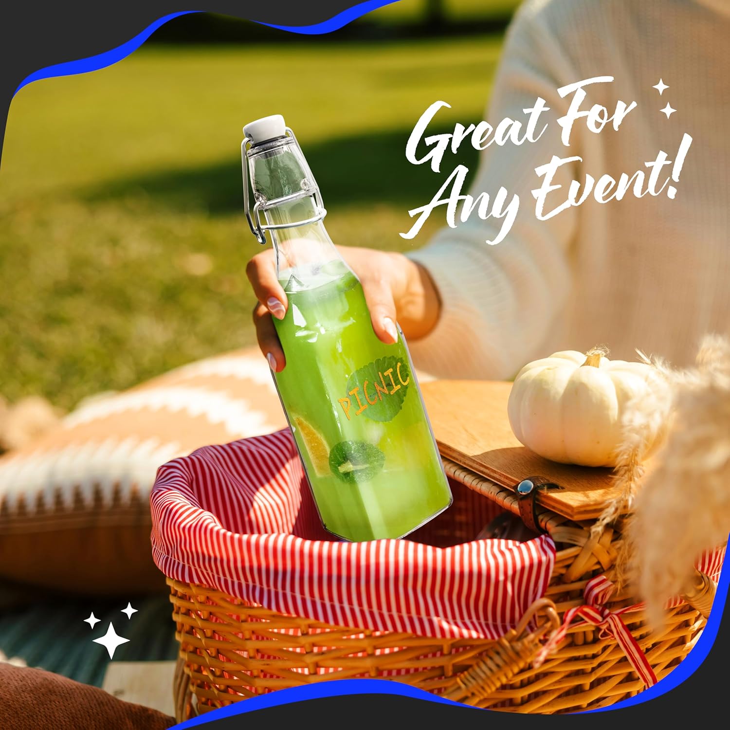 - Premium Quality Glass Drinking Bottles with Lids : Built with a focus on excellence, our square glass bottle with lid features a rust-proof steel closure for robustness against impacts & temperature changes. These reusable bottles are not only sturdy but also sustainable, thanks to the juice bottles glass construction. When the steel closure is removed, the empty bottles are dishwasher safe, so you can use these reusable bottles again & again. Replace flimsy plastic with our flip top bottles !