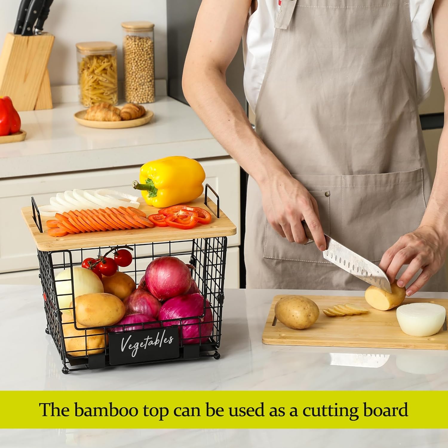 - ★Use As a Cutting Board - The bamboo top can be used as a chopping board. You can use it directly on the basket or take it down. The bamboo top is easy to install and remove.
