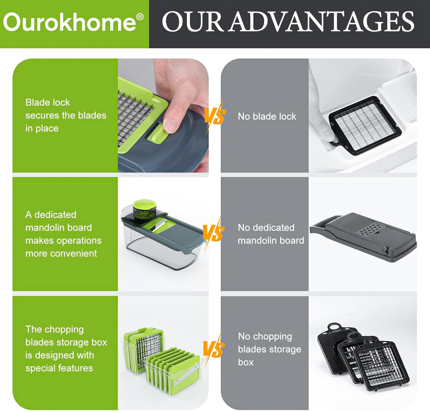 - A kitchen essential gadgets - Whether you're a novice cook or a seasoned pro, the Ourokhome 12 in 1 veggie chopper and spiralizer is a must-have in any kitchen. It's versatile, easy and safe to use and store, and it is a wise gifts choice for Christmas, new home, white elephant and more