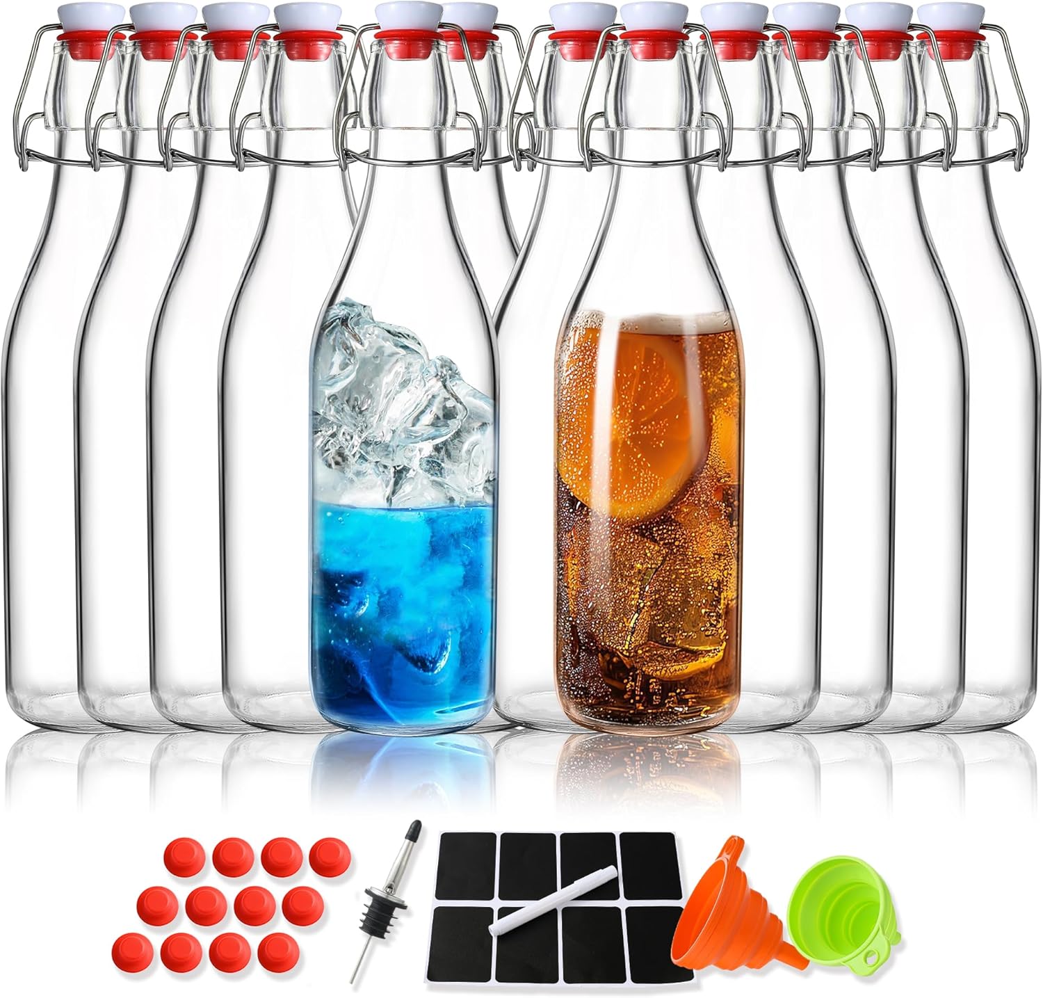 - ABUNDANTN SETS: Set includes 12*16 oz (450 ml) swing top glass bottles, 12 * replacement silicone pads, 2 *silicone funnels for easy pouring of liquids, 1 *white pen and 8 * labels to keep track of the date and liquids and 1 *replaceable pouring nozzles for pouring olive oil, vinegar and more.