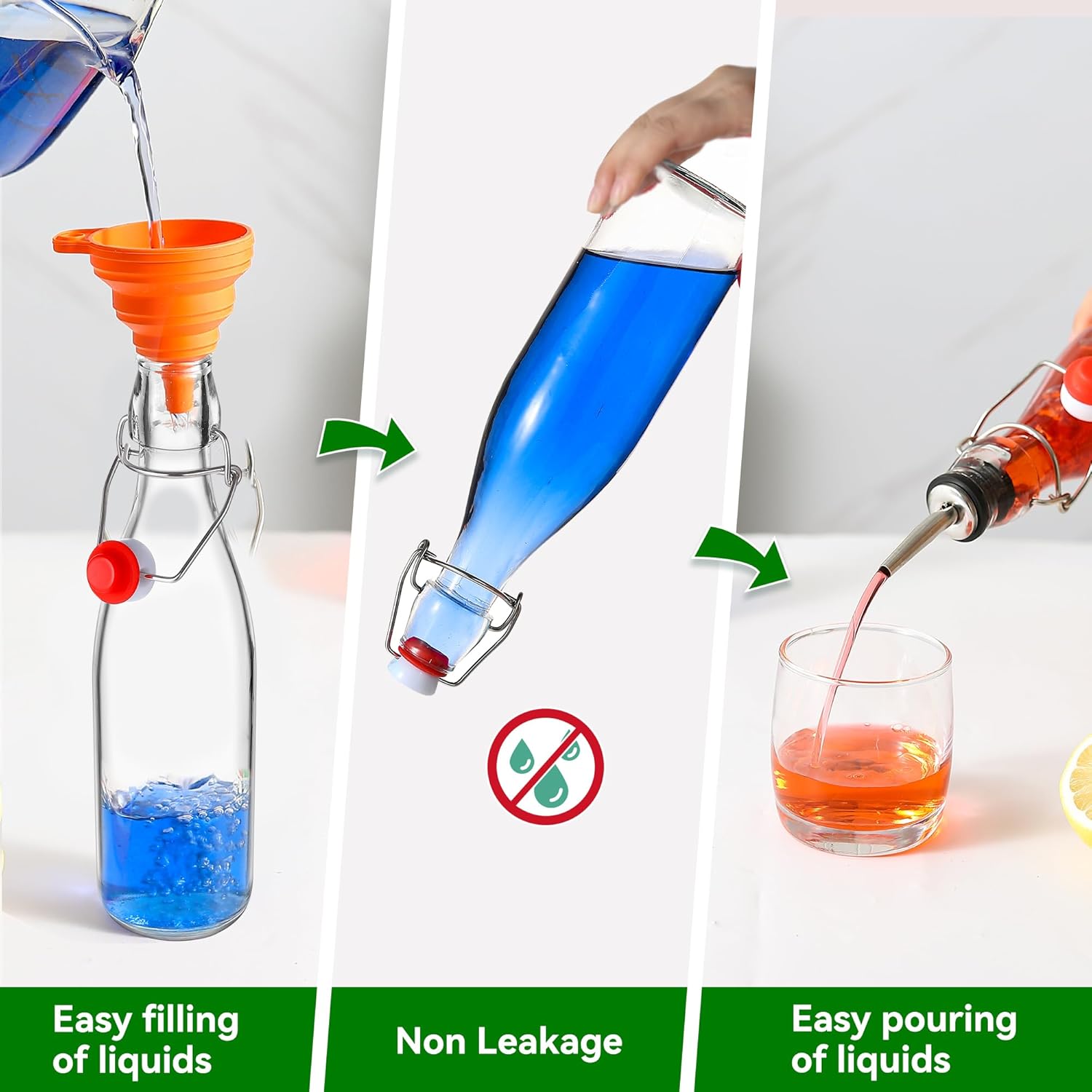 - ABUNDANTN SETS: Set includes 4*16 oz (450 ml) swing top glass bottles,4 * replacement silicone pads, 1 *silicone funnels for easy pouring of liquids, 1 *white pen and 8 * labels to keep track of the date and liquids and 1 *replaceable pouring nozzles for pouring olive oil, vinegar and more.
