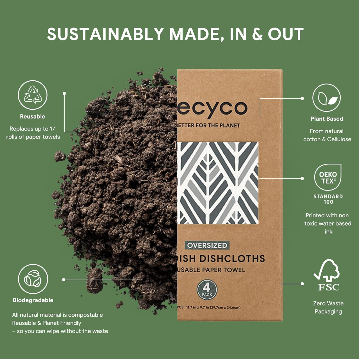 - Plant-Based & Biodegradable: Our 12” x 10” swedish dishcloth is 100% biodegradable, vegan, and free from harmful chemicals. Made from FSC certified cellulose and cotton fibers, it can decompose naturally in just 6-8 weeks, making it your best conscious choice for a greener lifestyle.