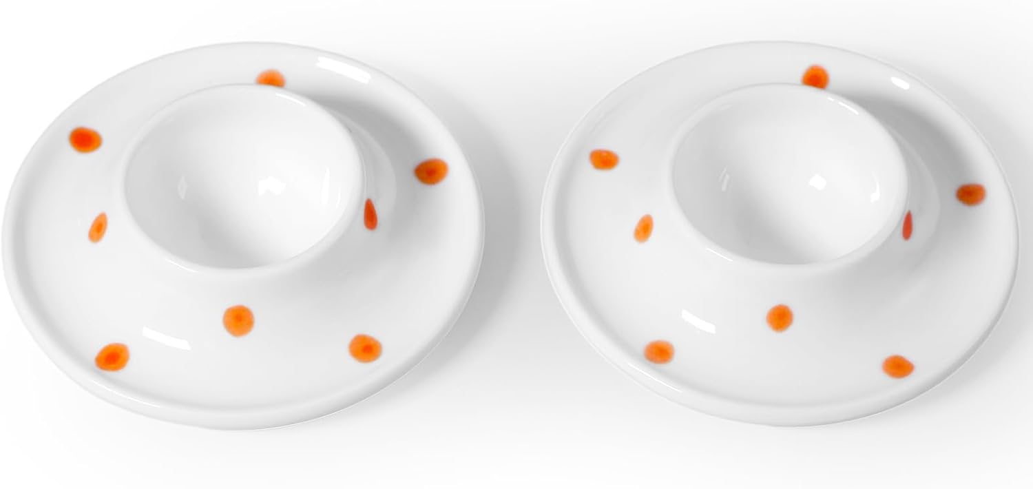 Cinf Ceramic White Egg Holder Set of 2 Porcelain Holder Breakfast Boiled Cooking Easy to Clean Childhood Memories Kitchen(Orange Dot)