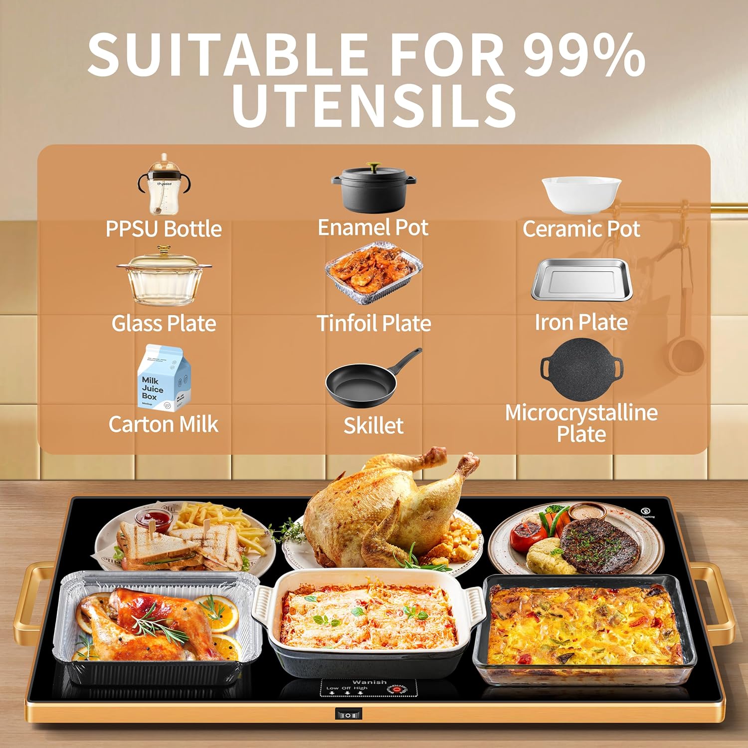 - Unique Warming Tray - Wanish warming trays for buffets party are designed to keep dishes at a consistent, warm temperature, making them ideal for buffets, parties, or family gatherings. Made of heat-resistant tempered glass with gold handles and metal edges, the food warming tray is both elegant and anti-scald. With a large capacity for multiple dishes, easy-to-use push-button temperature control, and a built-in thermostat to keep the food warmer tray safe to use for long periods of time.