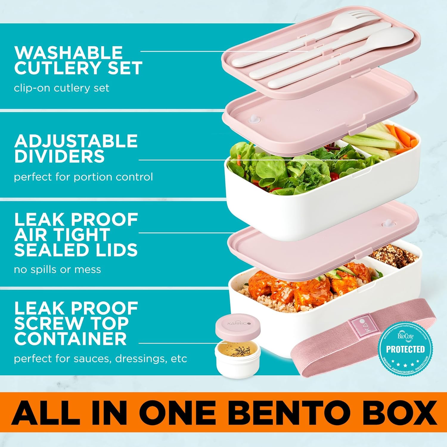 - Quick and Easy Meals On-The-Go: When you live a busy life, finding fresh, healthy meals can be difficult. Thankfully, with the KARRICO double bento box, you can sustain your health regimen on the go. Our sealed stackable containers come with leakproof lids and a knife, fork, and spoon that conveniently clips under the top cover. There are also adjustable dividers and a separate leakproof screw-top tub for sauces or dressing.
