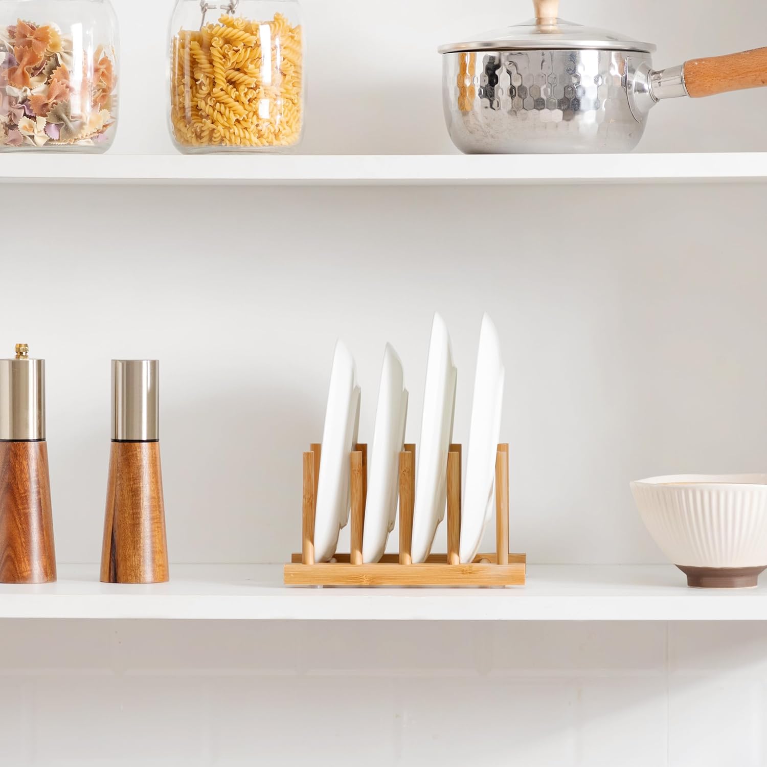 - 【Save Space】The kitchen plate organizer divides the space in an orderly manner, so that each plate/cup/ or book can be placed independently in a compartment, effectively solving the messy situation of stacking tableware/books, etc., so that you can quickly find the book you want to read or the plate you want to use, greatly improving the efficiency of life and learning.