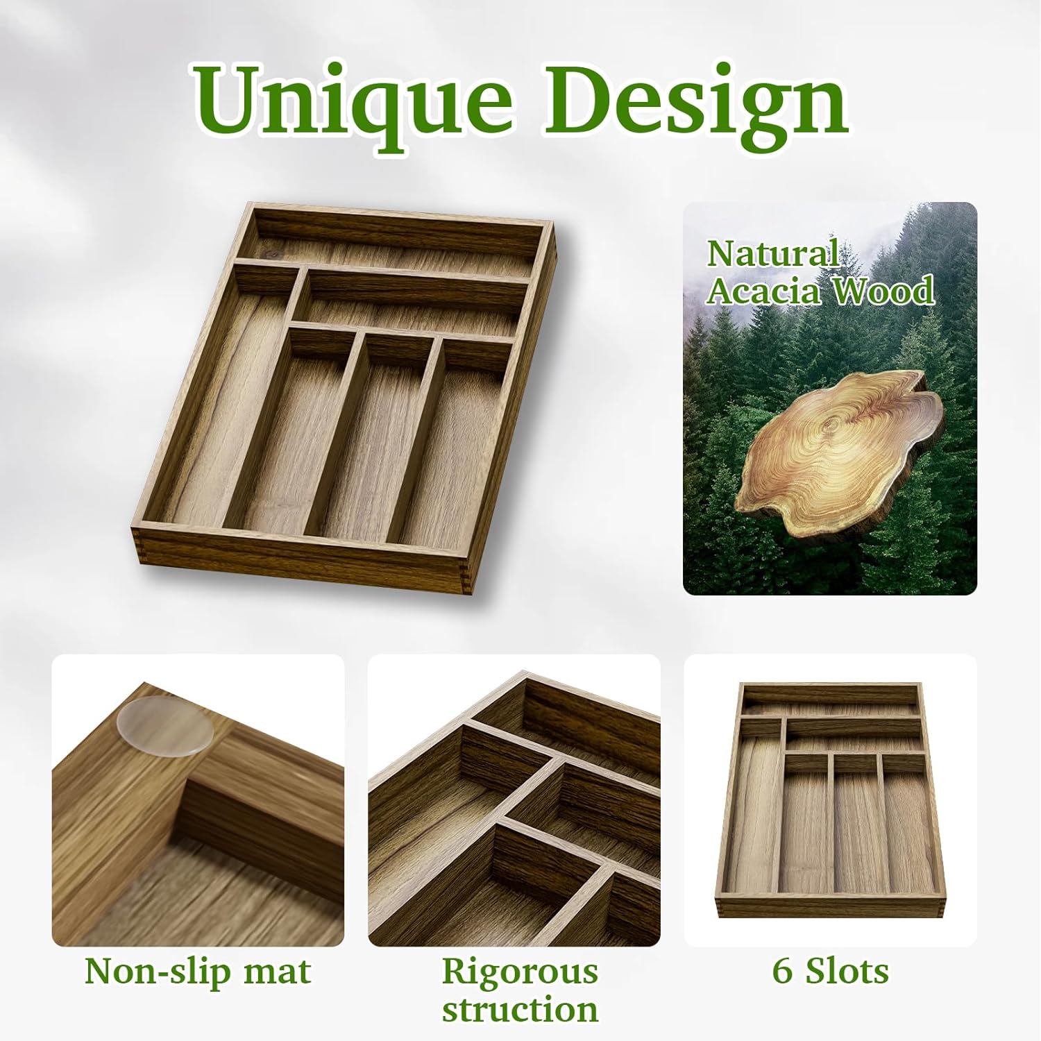 - 𝐍𝐚𝐭𝐮𝐫𝐚𝐥 𝐀𝐜𝐚𝐜𝐢𝐚 𝐖𝐨𝐨𝐝-Made of acacia wood, this silverware drawer organizer is very attractive, well made and easy to clean. More resistant than plastic and other materials. The color of natural wood is so beautiful and rich.