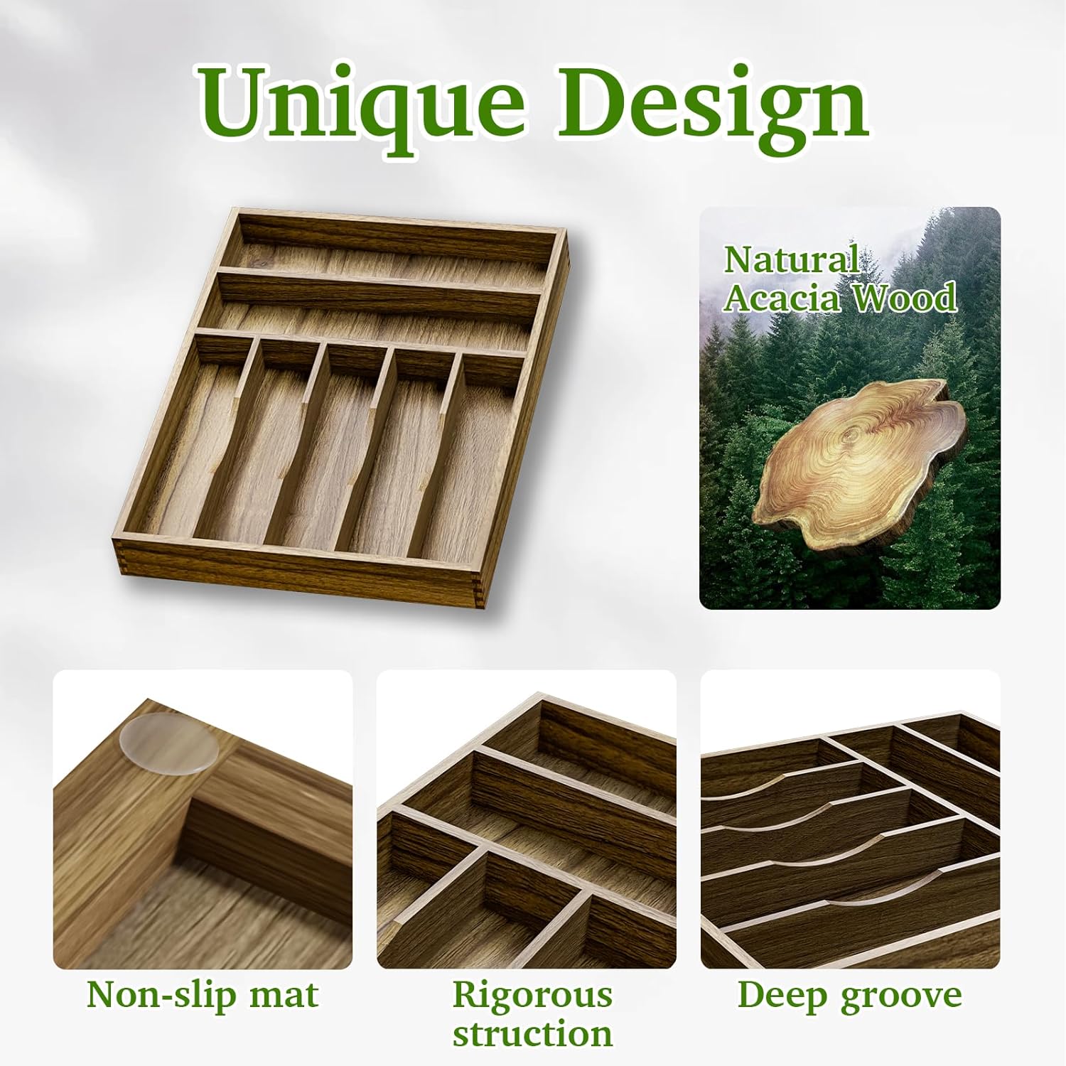 - 𝐍𝐚𝐭𝐮𝐫𝐚𝐥 𝐀𝐜𝐚𝐜𝐢𝐚 𝐖𝐨𝐨𝐝-Made of acacia wood, this silverware drawer organizer is very attractive, well made and easy to clean. More resistant than plastic and other materials. The color of natural wood is so beautiful and rich.