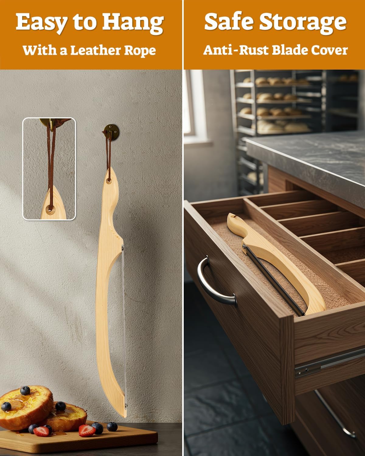 - Premium Bow Body: Crafted from Pine wood, the sourdough bread baking supplies feature a beautifully designed bow body that not only enhances aesthetic appeal but also provide exceptional durability. The natural properties of this bread cutter make it resistant to moisture and decay, ensuring a long-lasting tool for your kitchen. The ergonomic design of the bread knife for homemade bread allows for a comfortable grip, making slicing effortless