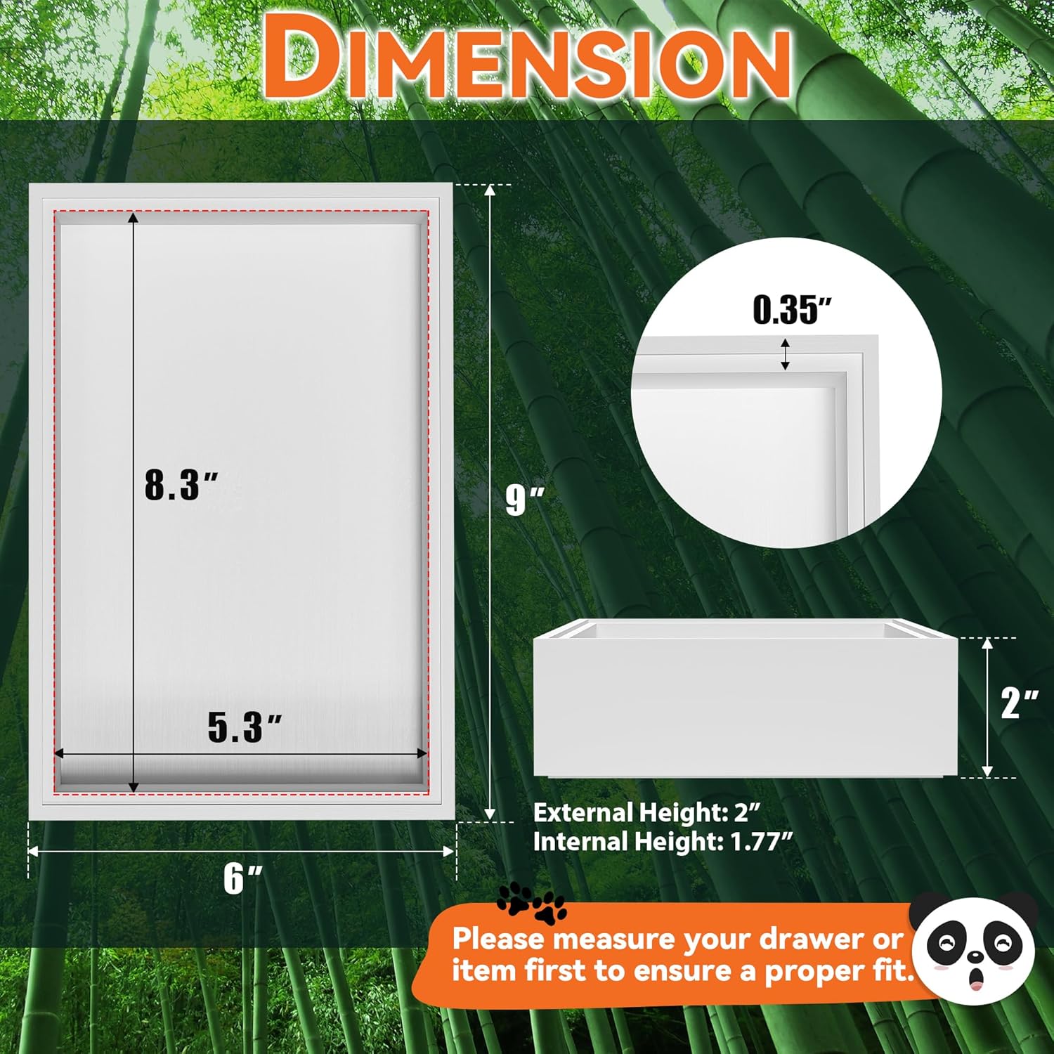 - Each bamboo drawer organizer measures: external size: 9" L x 6" W x 2" H; internal size: 8.3" L x 5.3" W x 1.77" H. Please check the size before purchasing