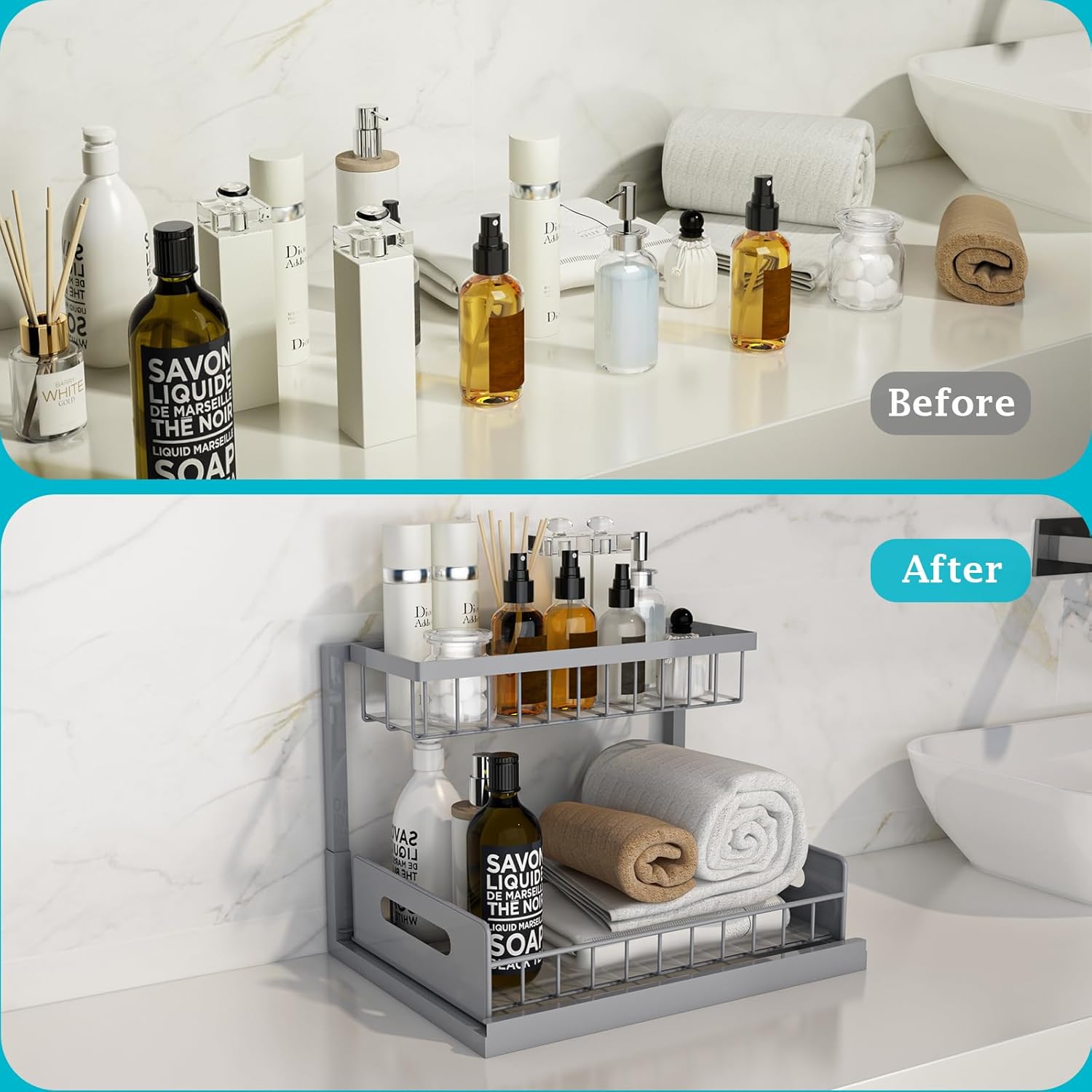 REALINN Under Sink Organizer, Pull Out Cabinet Organizer 2 Tier Slide Out Sink Shelf Cabinet Storage Shelves, Storage for Kitchen Bathroom, Grey, 1 Pack