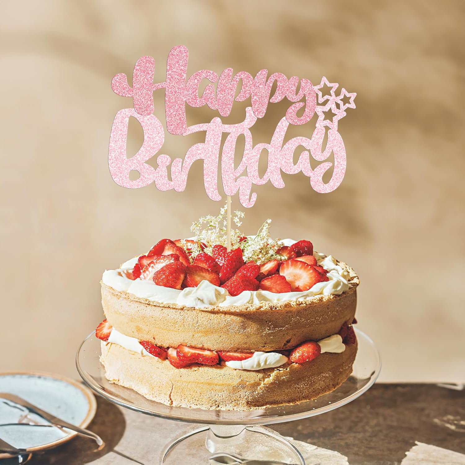 Ephlyn 1Pcs Happy Birthday Cake Topper Glitter Happy Birthday Cake Pick Decorations for Celebrating Happy Birthday Anniversary Theme Party Cake Decorations Supplies Pink Light Pink