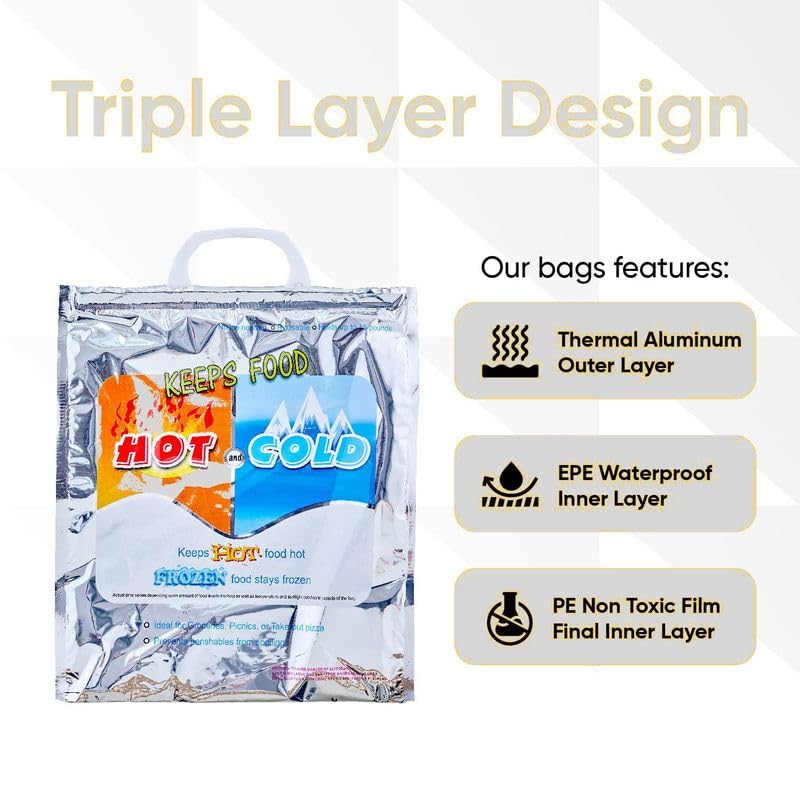 - ✅ TRIPLE LAYER DESIGN - Most other bags are single layer and aren't efficient at maintaining internal temperatures or will start to leak moisture. Our bags feature a sturdy thermal aluminum outer layer, an inner EPE (eco friendly plastic) waterproof layer and a final inner PE non toxic film layer.