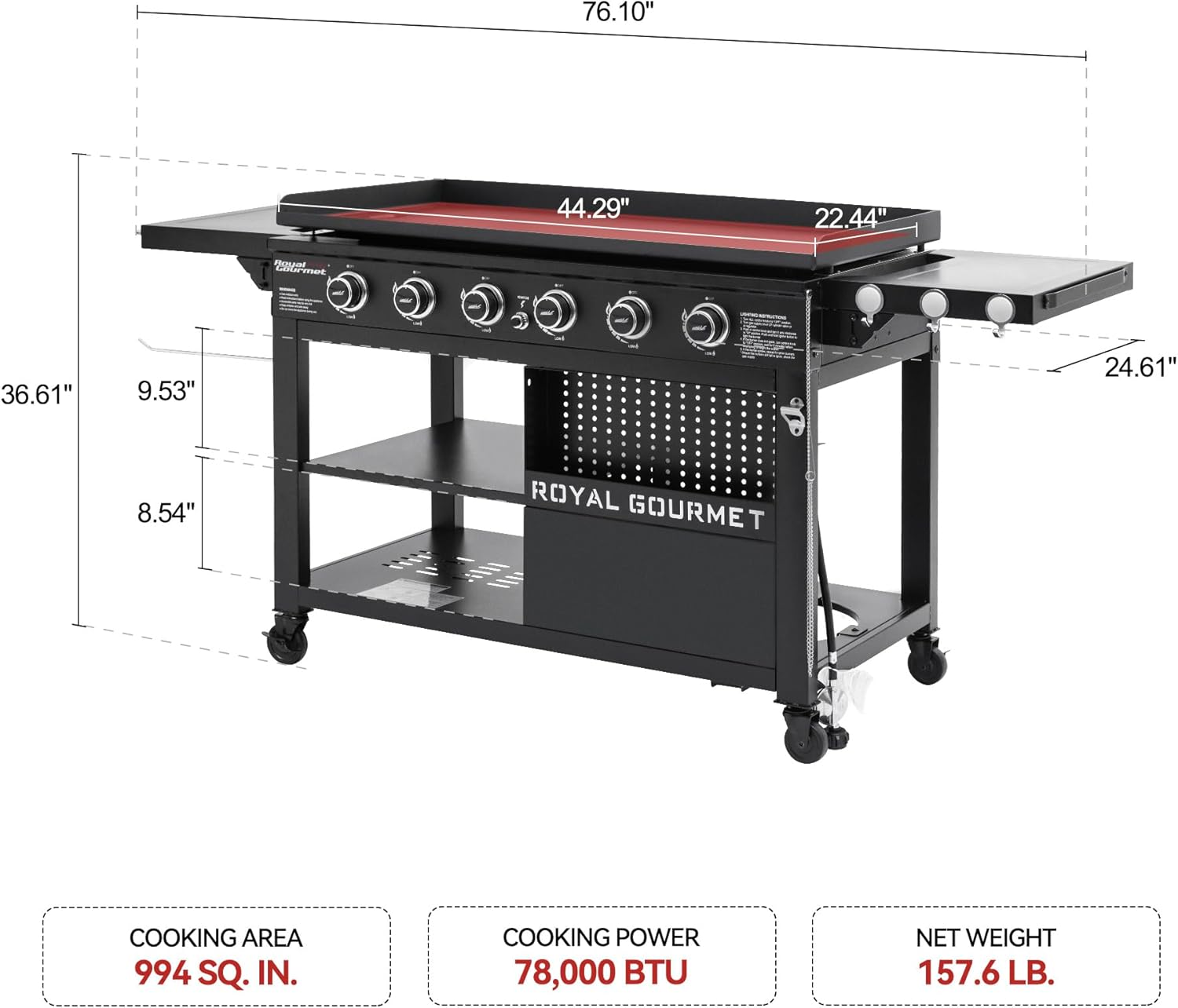 Royal Gourmet GB6000 6 Burner Propane Gas Griddle with Folding Side Tables, 44-Inch Flat Top Grill with Double-Layer Bottom Shelves for Outdoor Party or Backyard Barbecue, Black