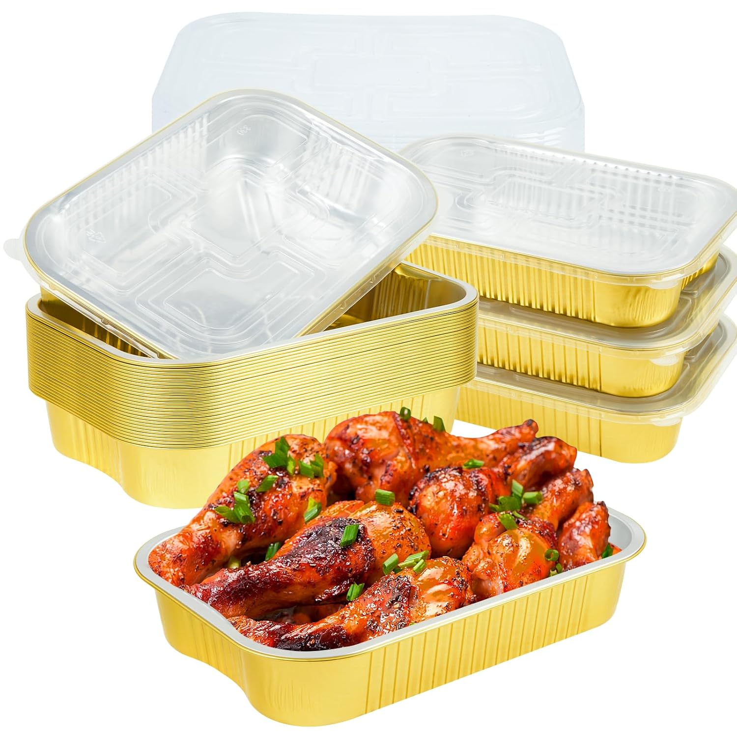 - 【Safety & Time Saving】JARDLITE gold aluminum foil pan is made of high quality aluminum material, which is 2 times harder than other silver aluminum foil pans, lightweight and sturdy, not easy to deform, high temperature resistant, and can withstand oven temperatures up to 600°F. Food grade plastic cover. Does not contain harmful substances, healthy and safe. Use these takeout containers to pack food and do all the work, saving you time!
