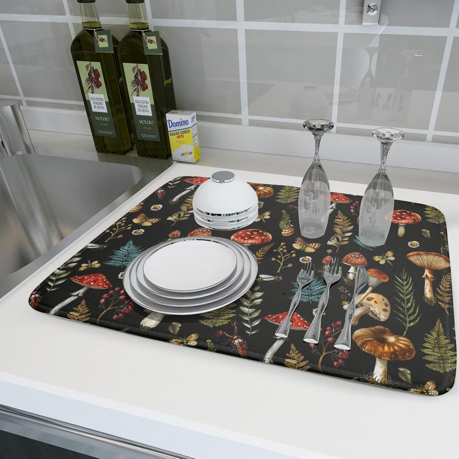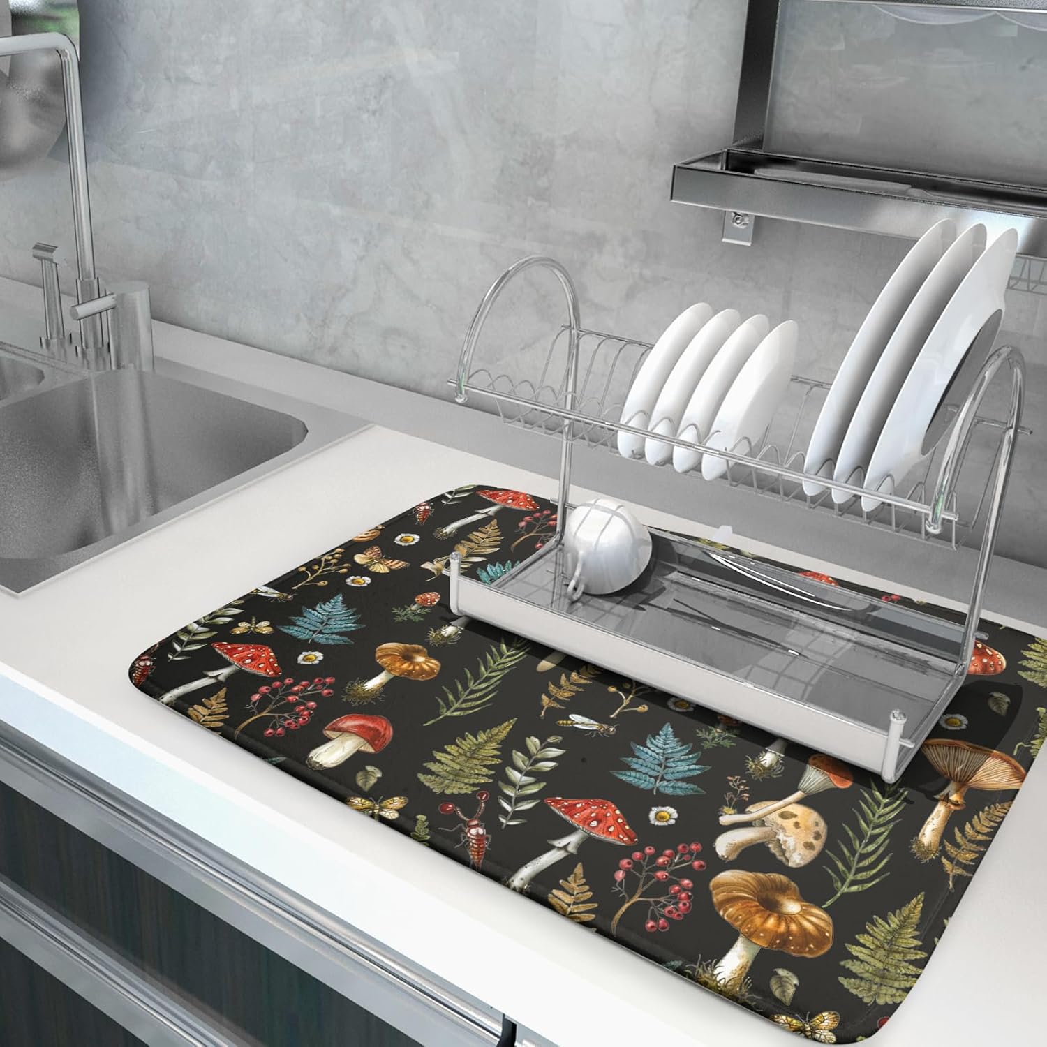 Natural Botanical Dish Drying Mat Mushroom Fern Leaves Berry Drainer Mat Black Drying Pad for Countertop 18 X 24 Inch