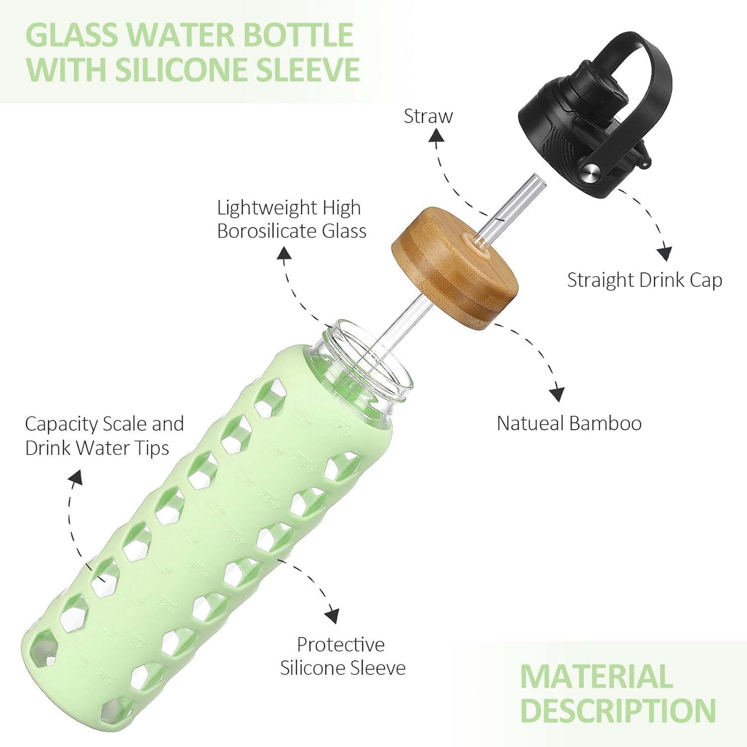 - GLASS WATER BOTTLES WITH TIME MARKER:MUKOKO 32oz glass water bottle with time marker preserves the purity of water.This is a very handy way to keep up with daily water intake,stay hydrated and healthy.