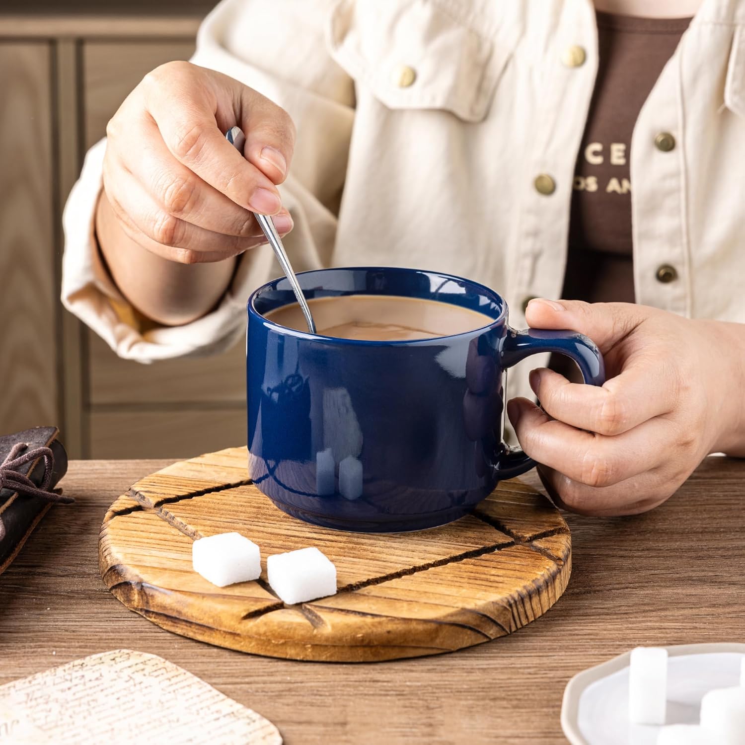 - Stylish DesignWIth Large Handle Design: These coffee mugs features a large handle that provides a comfortable and secure grip. the handle remains cool even after microwaving and the beverages stay warm. These mugs set feature a beautiful embossed texture design, the smooth rim ensures a comfortable drinking experience, and the stackable design allows for easy storage and helps save space in your kitchen.