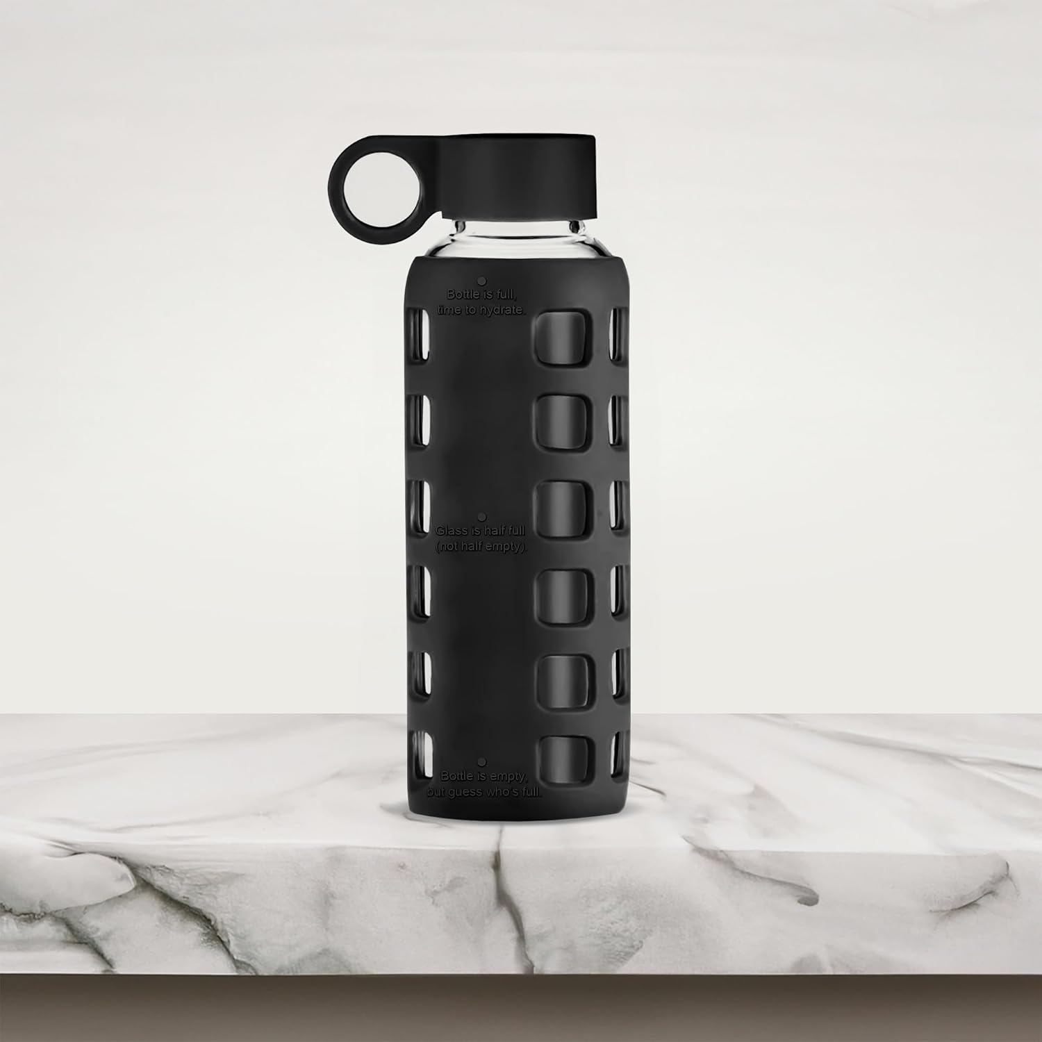 purifyou 40oz / 32oz / 22oz / 12oz Borosilicate Glass Water Bottle with Time & Volume Markers, Silicone Sleeve, Stainless Steel Lid – Reusable Glass Bottle for Water & Juice (12oz Jet Black)