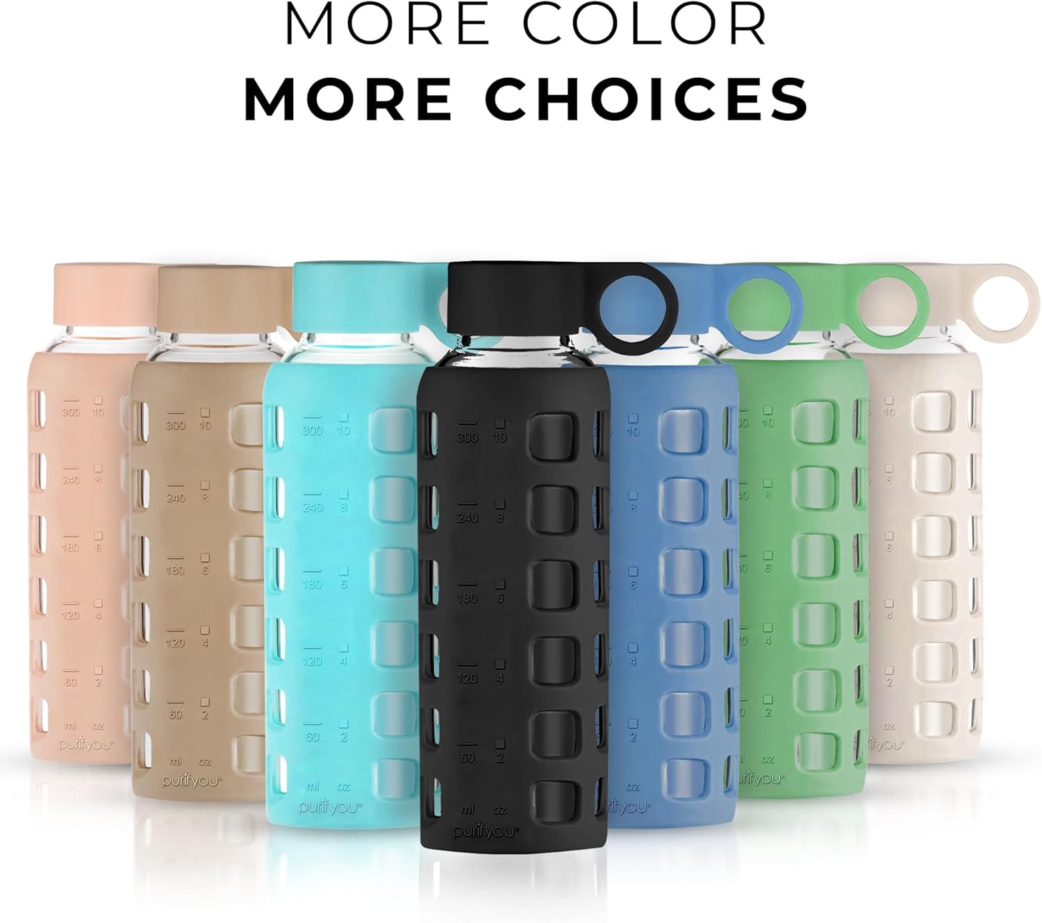 - Track & Improve Daily Hydration: Stay on top of your water goals with purifyou glass water bottles featuring clear, easy-to-read time and volume markings; ideal for workouts, travel, the office, or relaxing at home