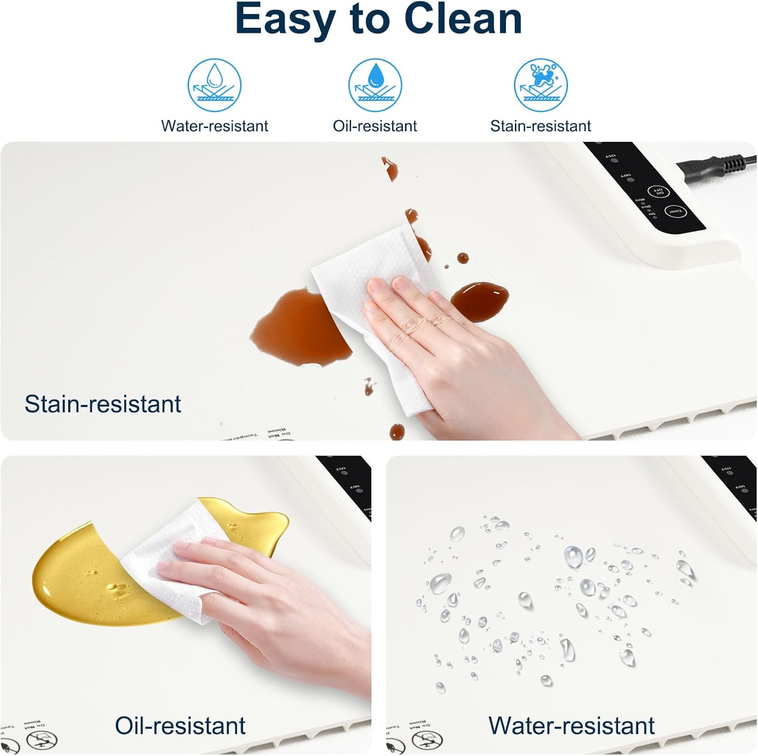 - [Nano-Silicone Easy Clean]: Our electric warming mat for food features premium nano-silicone material, splash, stain, and oil-resistant. Wipe it easily with a damp cloth or paper towel for spotless cleaning. Food-grade and safe for worry-free usage