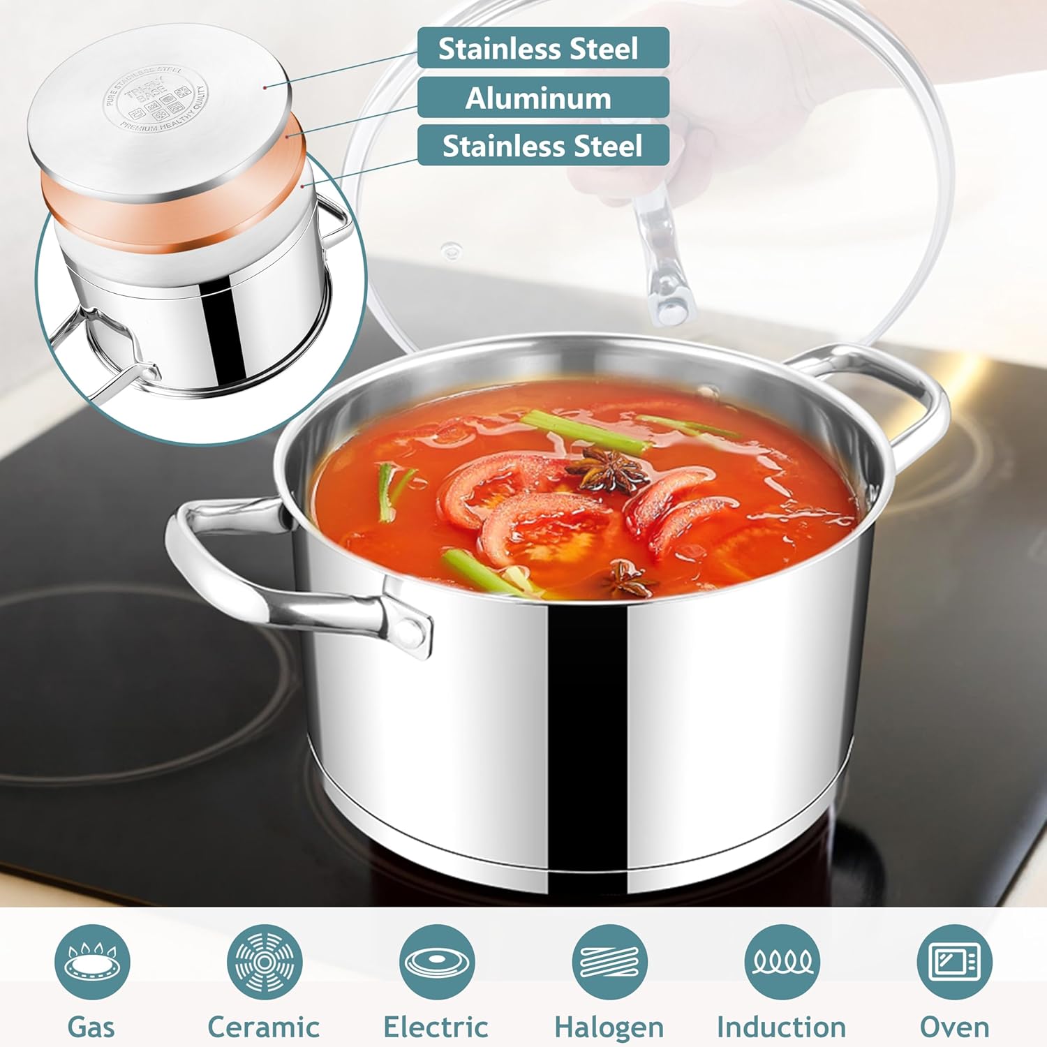 E-far 4 Quart Stock Pot with Lid, Stainless Steel Stockpot for Cooking Simmering Soup Pasta Sauce, with Tri-Ply Bottom & Visible Cover, Induction/Gas/Dishwasher Safe, Heavy Duty & Non Toxic