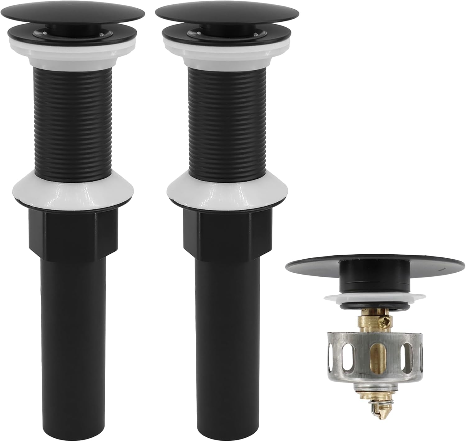 Bathroom Sink Drain,2 Pack Drain Stopper Without Overflow,Pop Up Drain Assembly with Detachable Strainer Basket,Built-in Anti-Clogging, Stainless Steel Nut Mattle Black