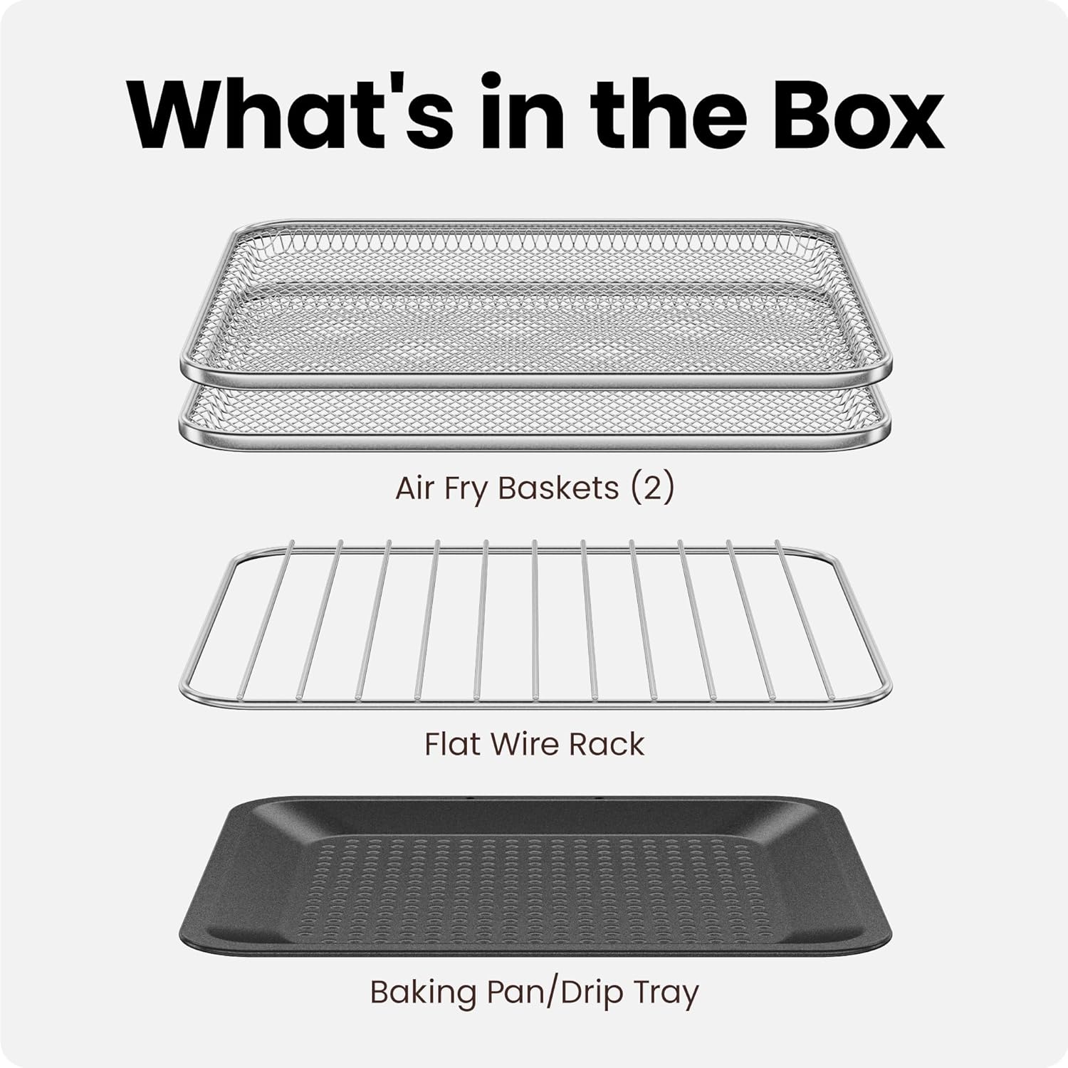- ACCESSORIES INCLUDED: Your small toaster oven comes with air fryer accessories for any meal, including two air-fry baskets, a flat wire rack, and a baking pan/drip tray.