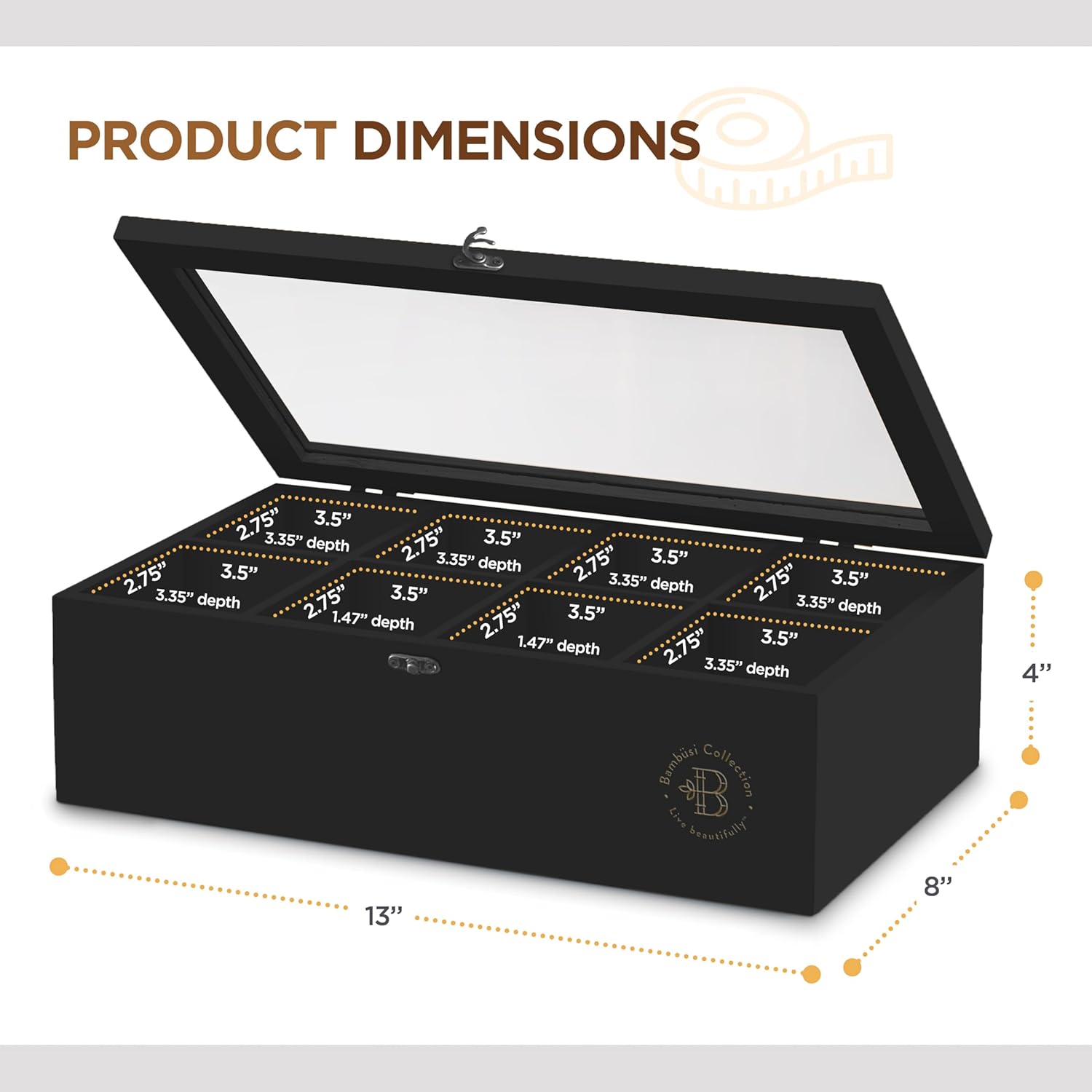 - See, Select, Sip: Dive into the world of tea effortlessly. With its clear window, our tea box organizer lets you easily view your entire collection of tea bags. Whether it's for your daily brew or a special blend, our tea organizer makes choosing your next cup a breeze. Measures 13" x 8" x 4"