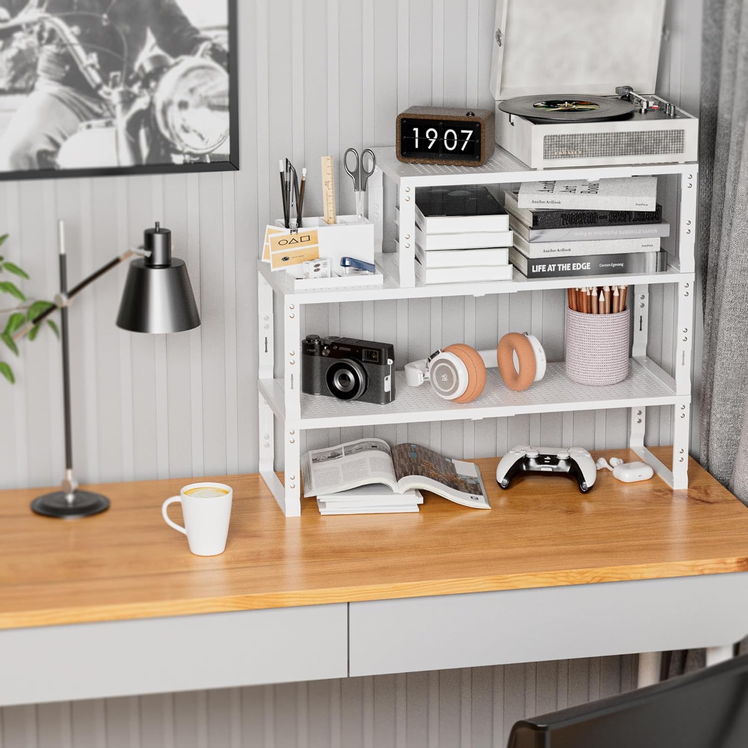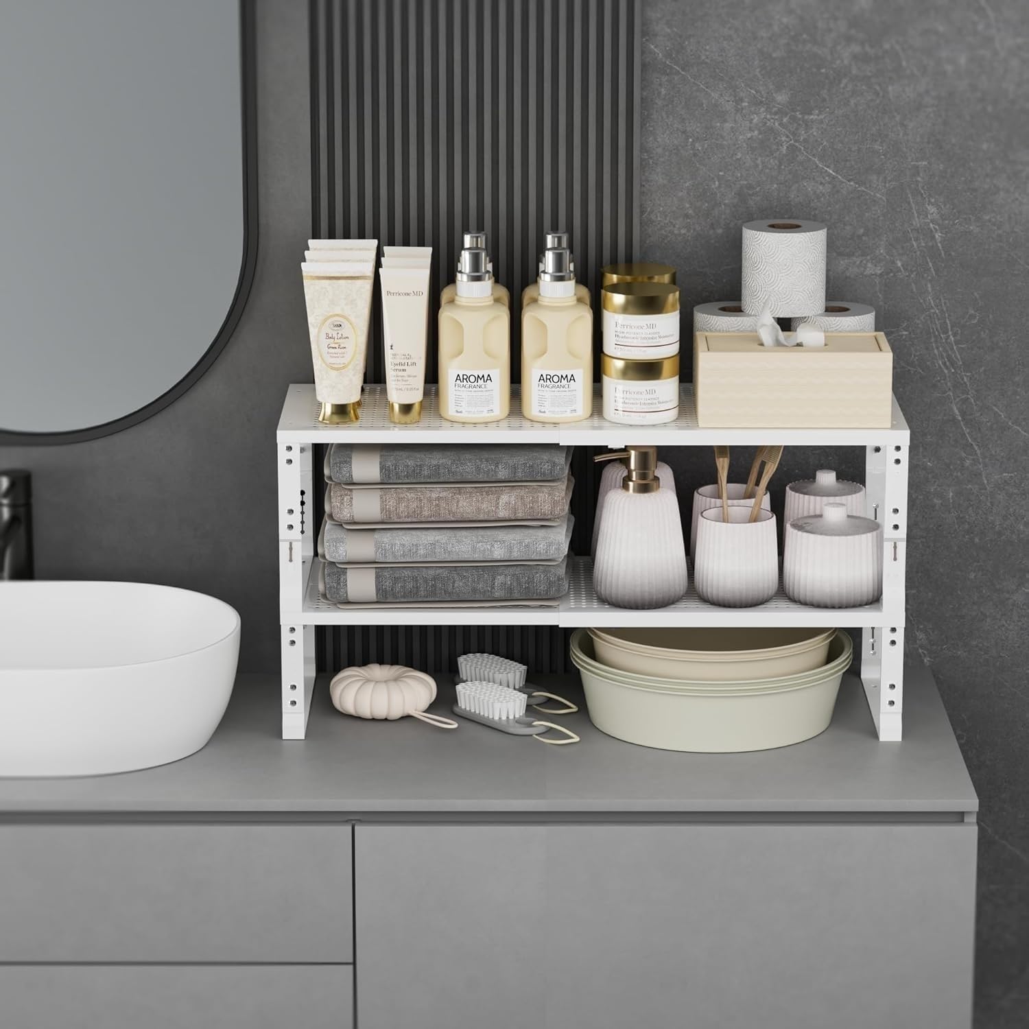- ⭐【Expandable,Stackable】The shelves can easily expand and contract according to your storage needs, whether it is kitchen clutter or office supplies.You can combine multiple shelves together to form a large storage system, or separate them into several separate smaller units(Measure:10.24"D x 16.54"W~27.17"W x 8.31"H/7.68"H/7.05"H/6.42"H)
