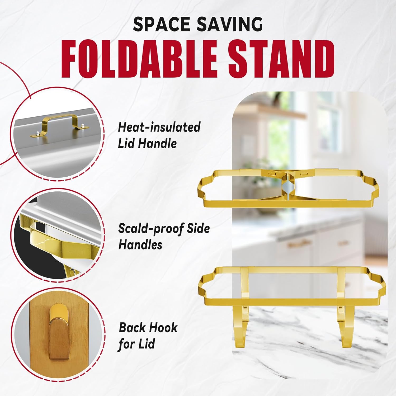 Chafing Dish Buffet Sets of 6, 8QT Stainless Steel Rectangular Chafers and Buffet Warmer Sets for Catering, with Food & Water Pan, Lid, Gold Foldable Frame, Fuel Holder for Event Party Holiday