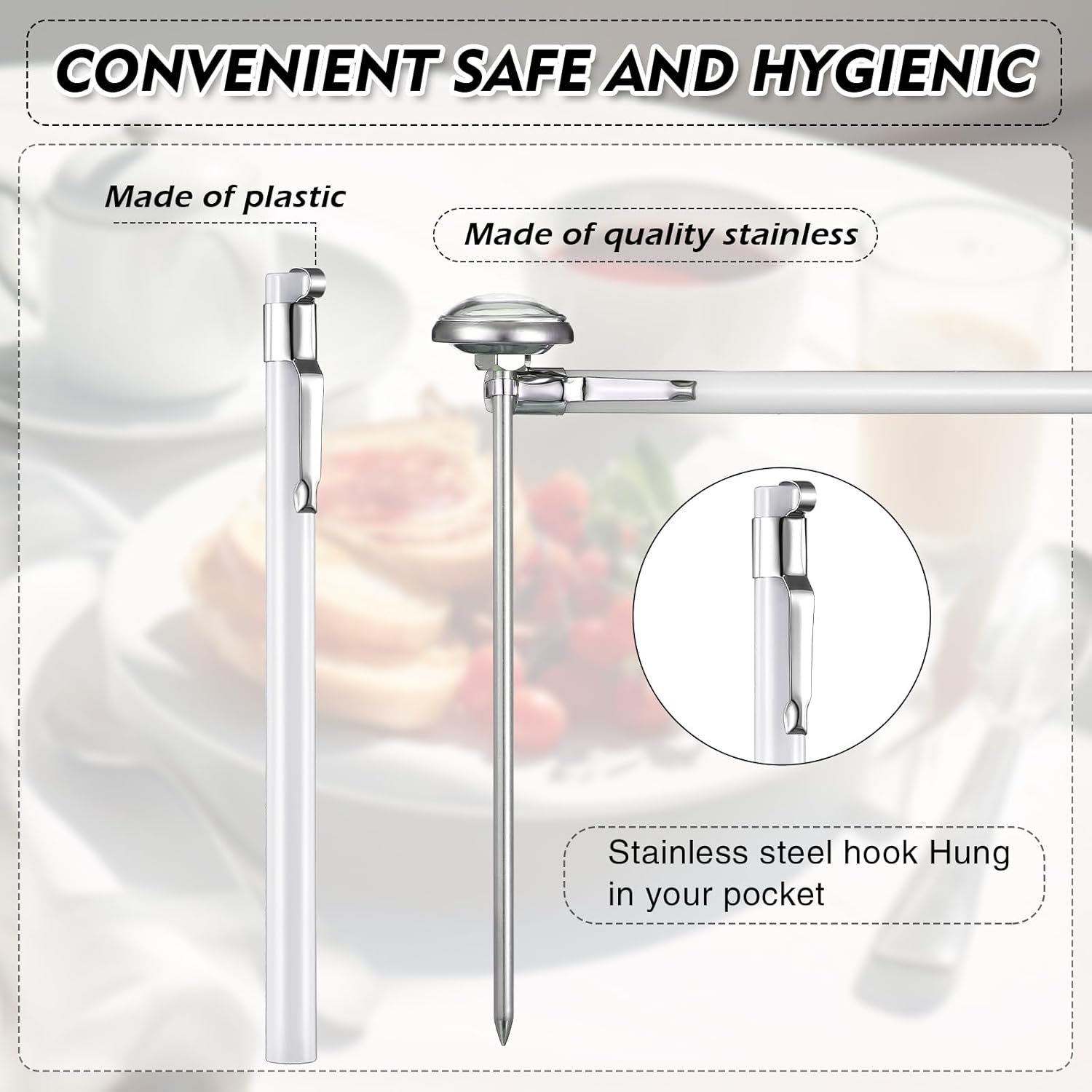 - Long Lasting and Quality: our cooking thermometer is made of stainless steel material with a plastic sleeve, reliable and long lasting, heat resistant and sturdy, not easy to break or rust, safe and quality, lightweight and portable, you can use it for a long time