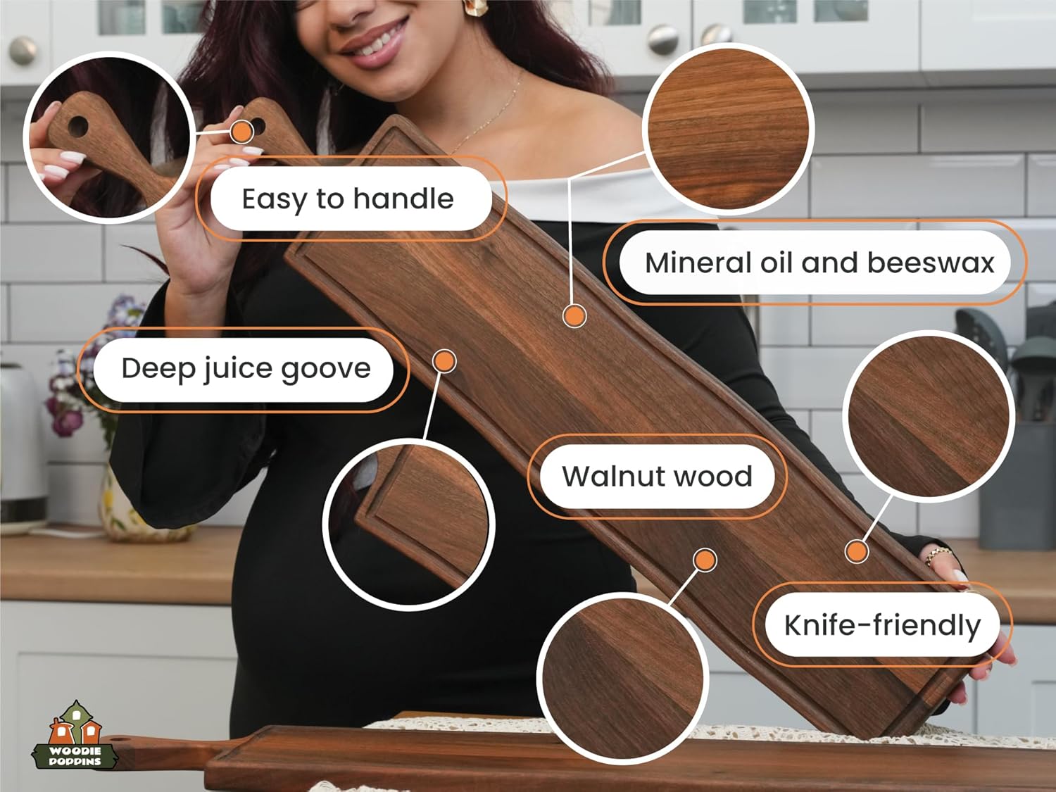 Elegant Walnut Wood Long Serving Board with Handle - Charcuterie Wooden Board - Stylish Versatility for Culinary Delights - Reversible with Juice Groove - 27.6x6.3x0.8 in - Woodie Poppins (Medium)