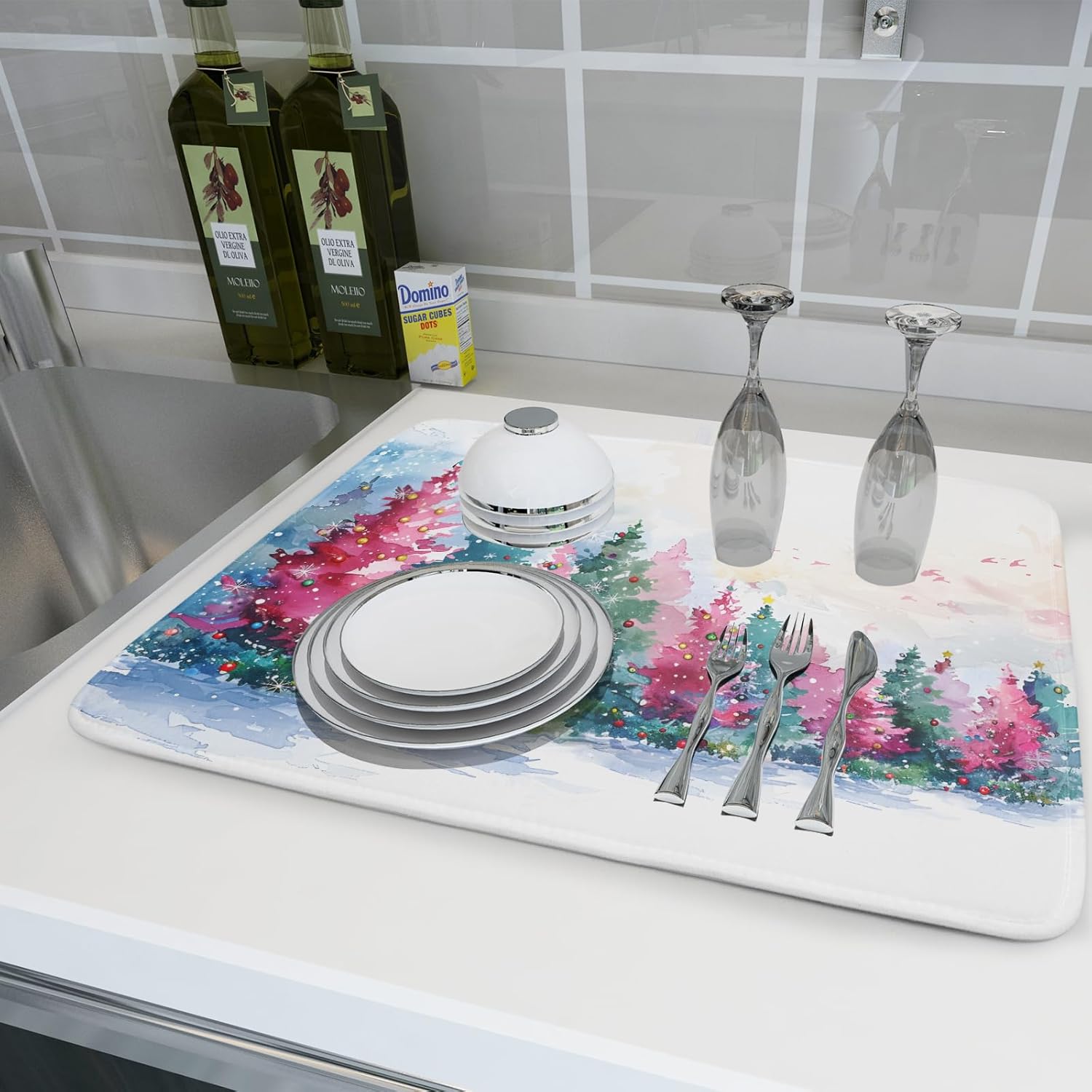 Decorative Christmas Dish Drying Mats Pink Green Xmas Tree Painting Rack Drainer Mats for Coffee Bar 18 X 24 Inch