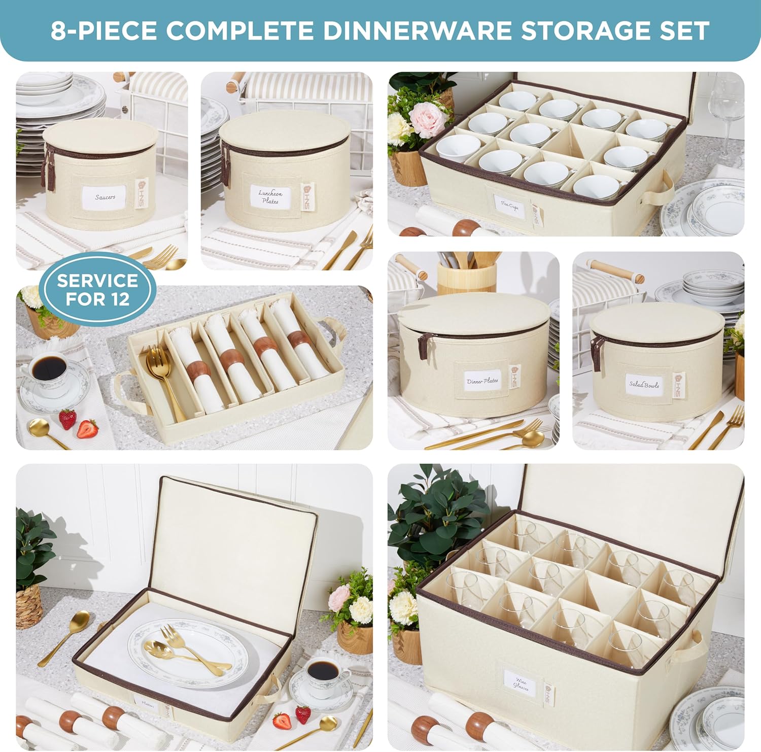 Hard Shell China Storage Containers 8-Piece Set Moving Boxes for Dinnerware, Glasses, Plates, Mugs and Saucers Sturdy Dish Organizer with Dividers for Seasonal Storage - Service for 12 - Beige