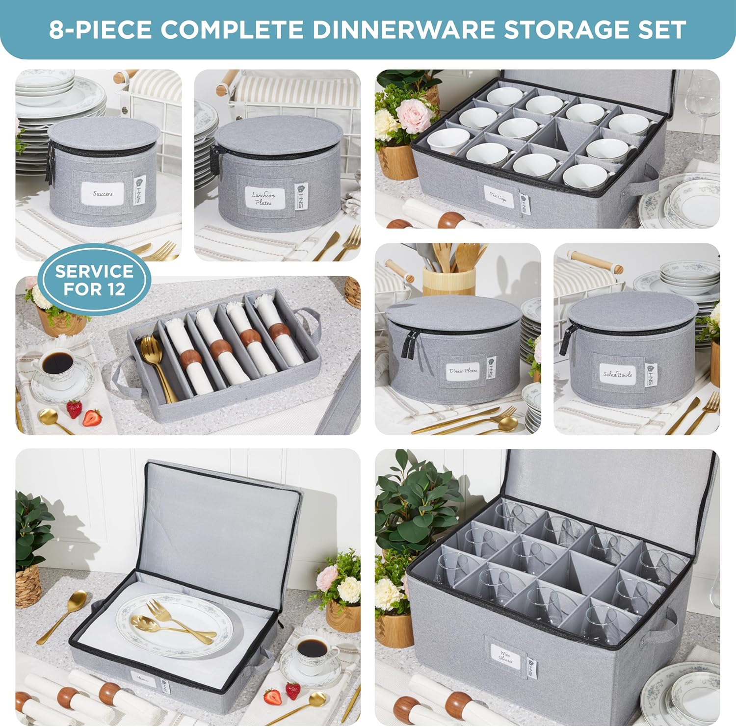 Hard Shell China Storage Containers 8-Piece Set Moving Boxes for Dinnerware, Glasses, Plates, Mugs and Saucers Sturdy Dish Organizer with Dividers for Seasonal Storage - Service for 12 - Gray