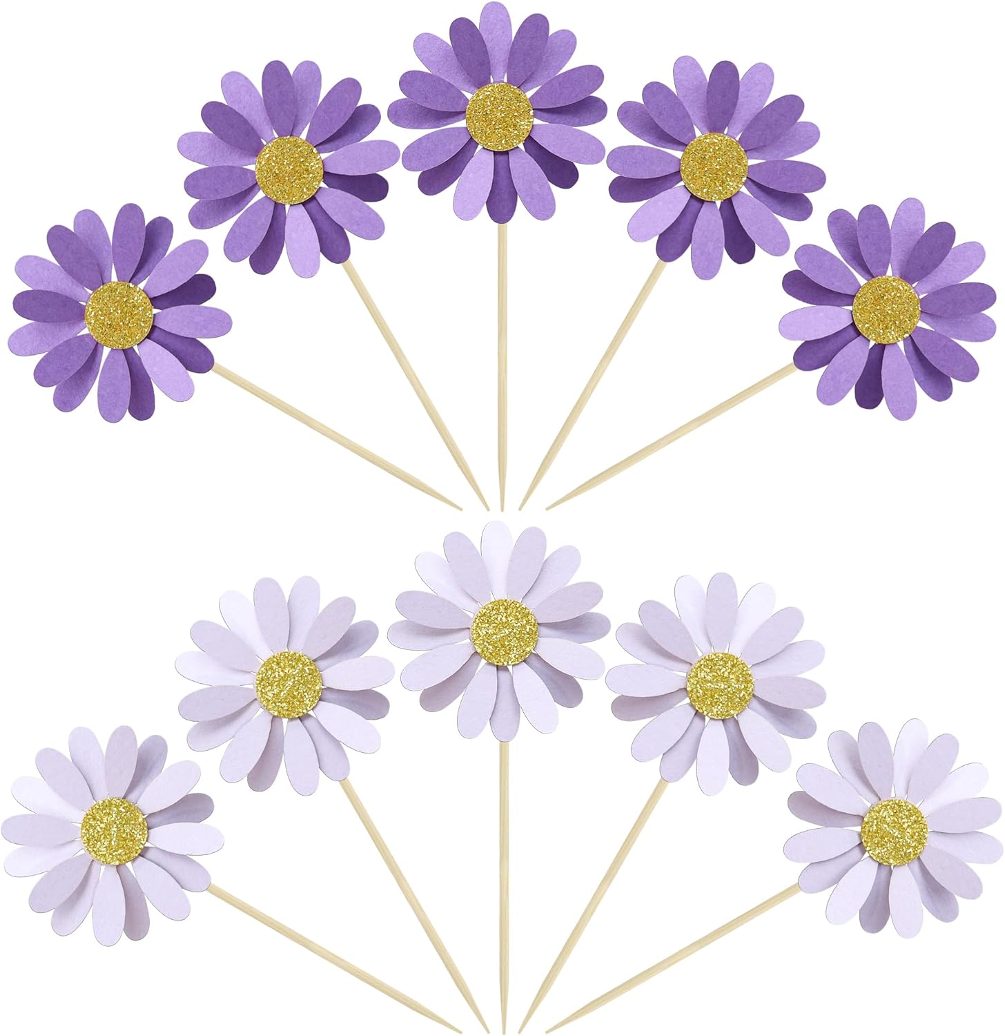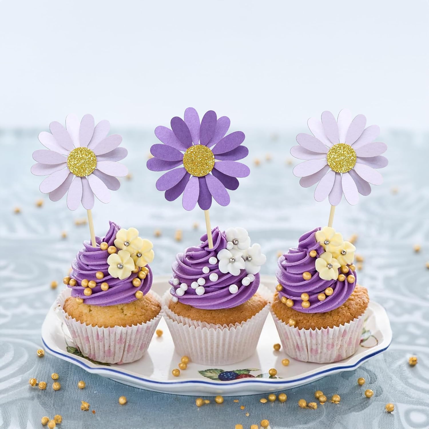 Ephlyn 24Pcs Purple Daisy Cupcake Toppers Flower Cake Toppers Daisy Cake Decorations Chrysanthemum Cupcake Toppers Spring Daisy Flower Cake Picks for Birthday Wedding Supplies