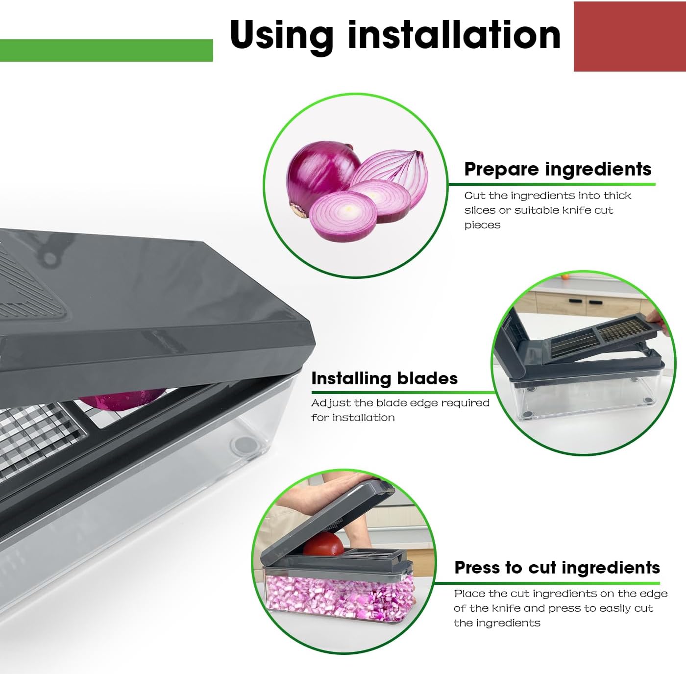 - SUPERIOR QUALITY: Professional multifunctional vegetable chopper slicer can chop and dice and more, all in one versatile kitchen gadget. Made of high quality materials, such as high quality stainless steel blades and food grade materials. A perfect tool for yourself or anyone who loves to cook.