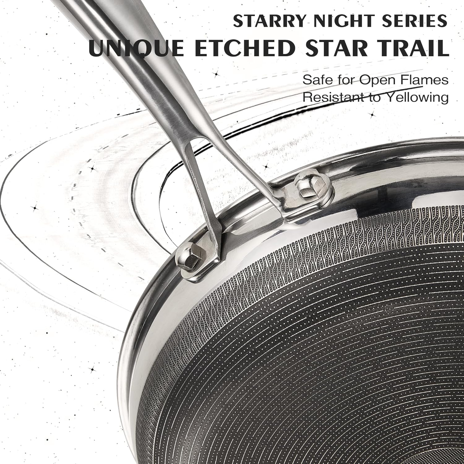 - 5-Layer Structure : The stainless steel frying pan features a nonstick titanium ceramic interior, a 4mm extra-thick aluminum core, and a dual-layer 403 stainless steel design, ensuring rapid and even heat distribution along with outstanding durability. The outer star-trail etched layer prevents yellowing caused by flames and stains. Its five-layer structure locks in heat, preserving flavors and textures for an exceptional cooking experience.