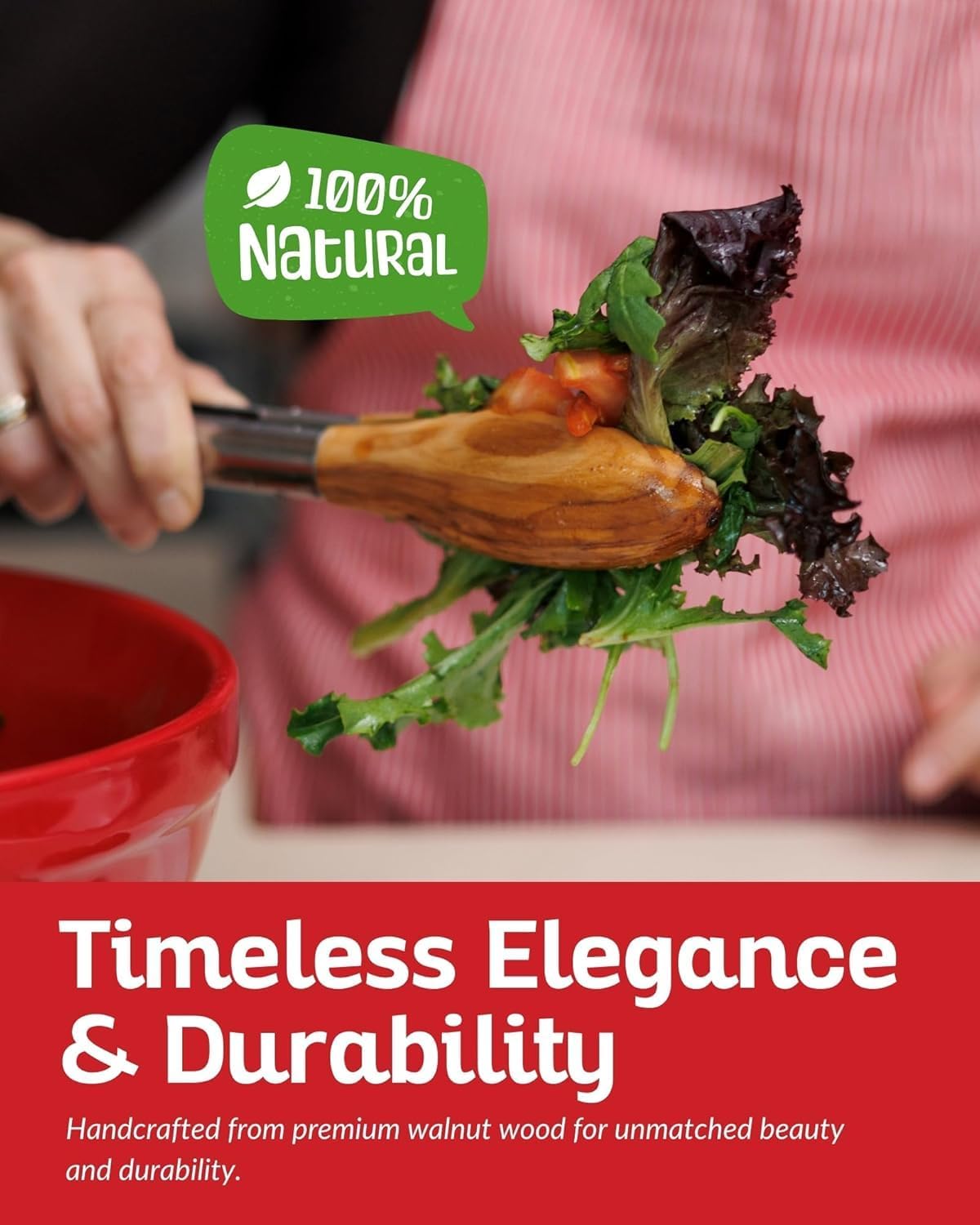 - NON-TOXIC NATURAL WALNUT WOOD: Our wooden tongs for cooking are expertly crafted from natural walnut wood, ensuring a non-toxic and safe experience. These serving tongs are reinforced with stainless steel, offering the durability needed for all your cooking tongs needs.