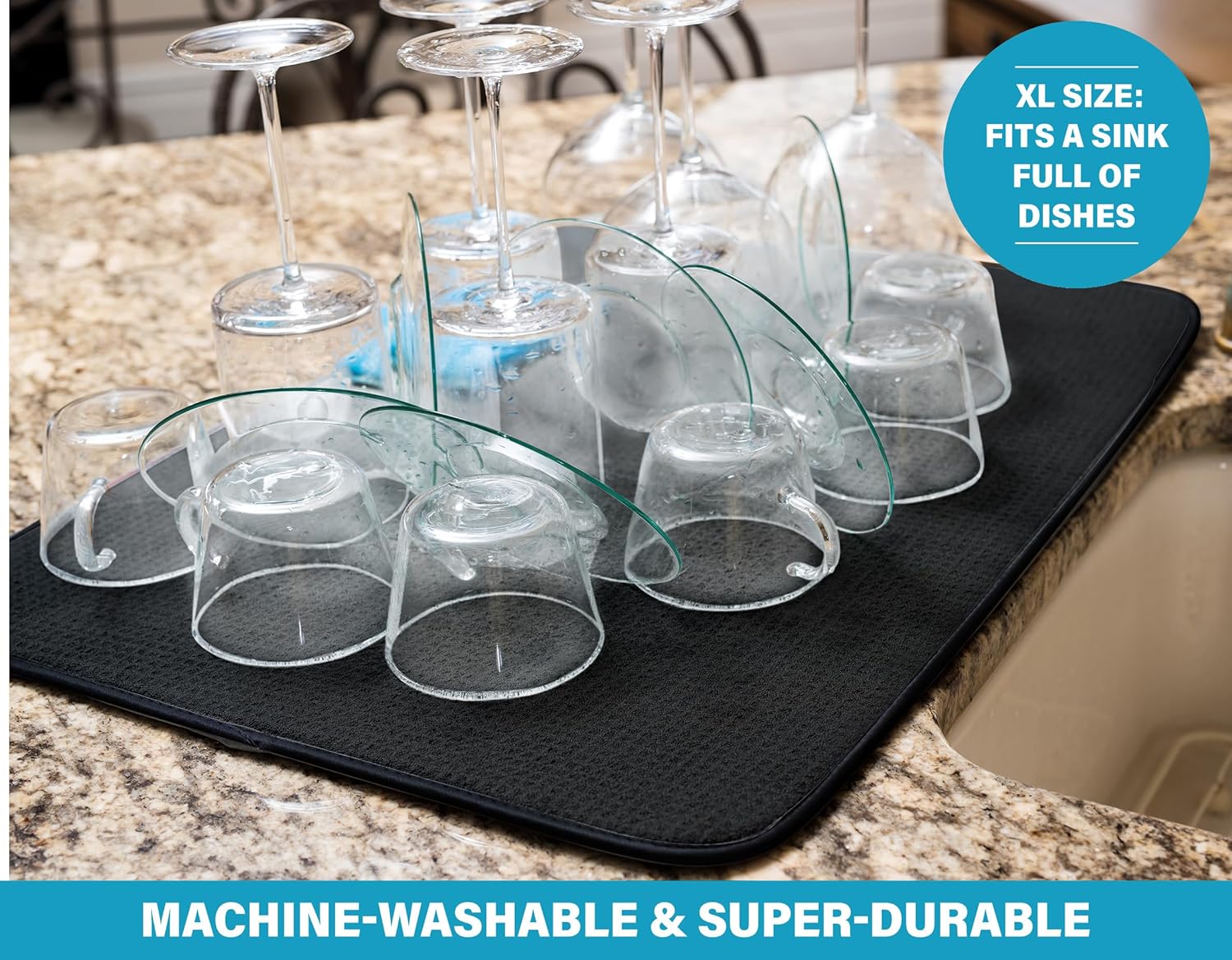 - THICKEST , STYLISH MAT | INNOVATIVE HONEYCOMB WEAVE: Keep your counter spotless even while washing a sink full of kitchen dishes . Our superbly stylish drying mat is among the thickest on the market today , and its innovative honeycomb microfiber structure enhances absorption and quickens drying time . Idea kitchen accessories for countertop
