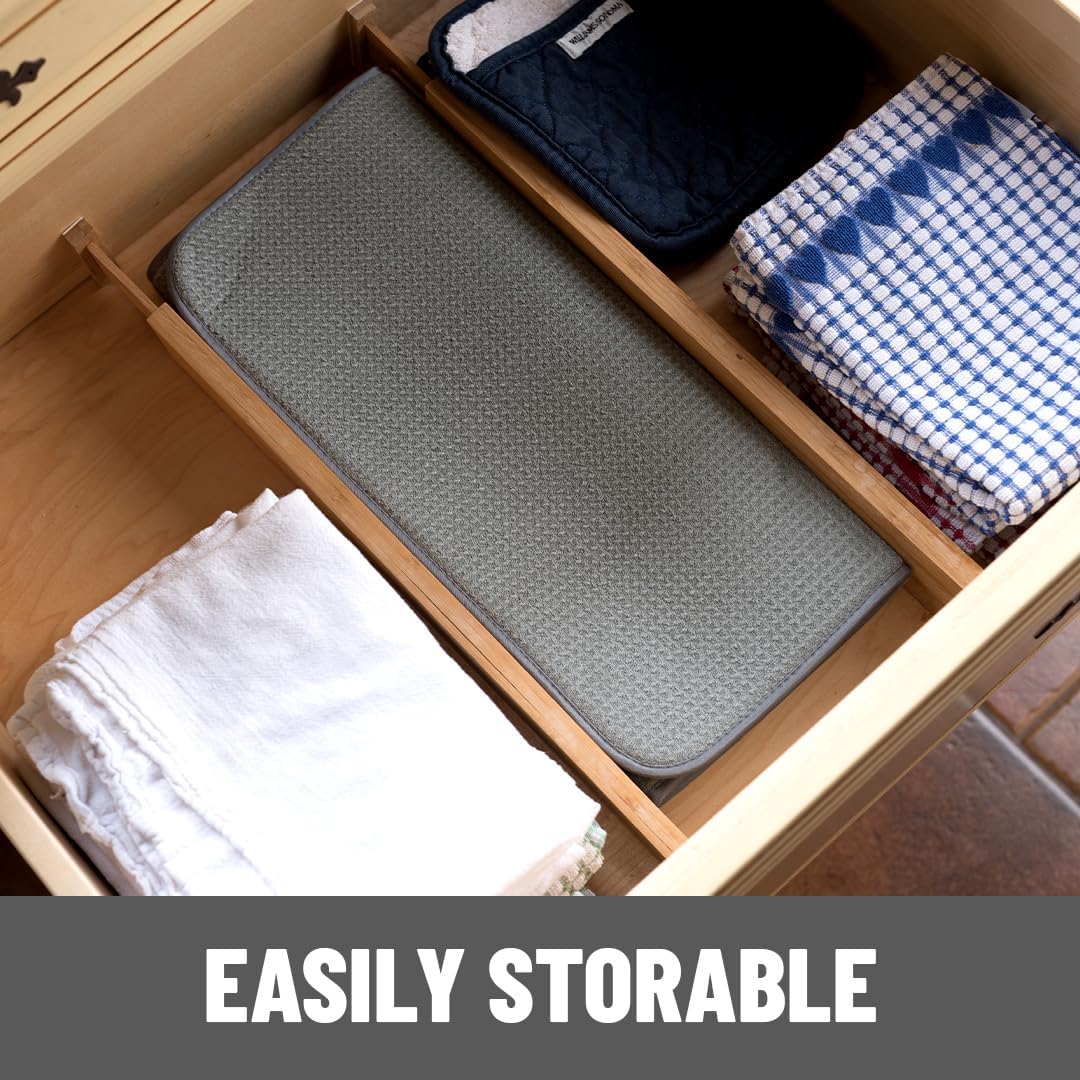 - QUICK-DRY HANG TAG | EASY STORAGE: Our manufacturing process creates naturally strong and durable dish-drying mats . Fold up and toss in a drawer or tuck it elsewhere when not in use , and simply hang with the reinforced tag to dry . Our flexible core , folded between high-tech layers of microfiber , the ideal dish dryer mats .
