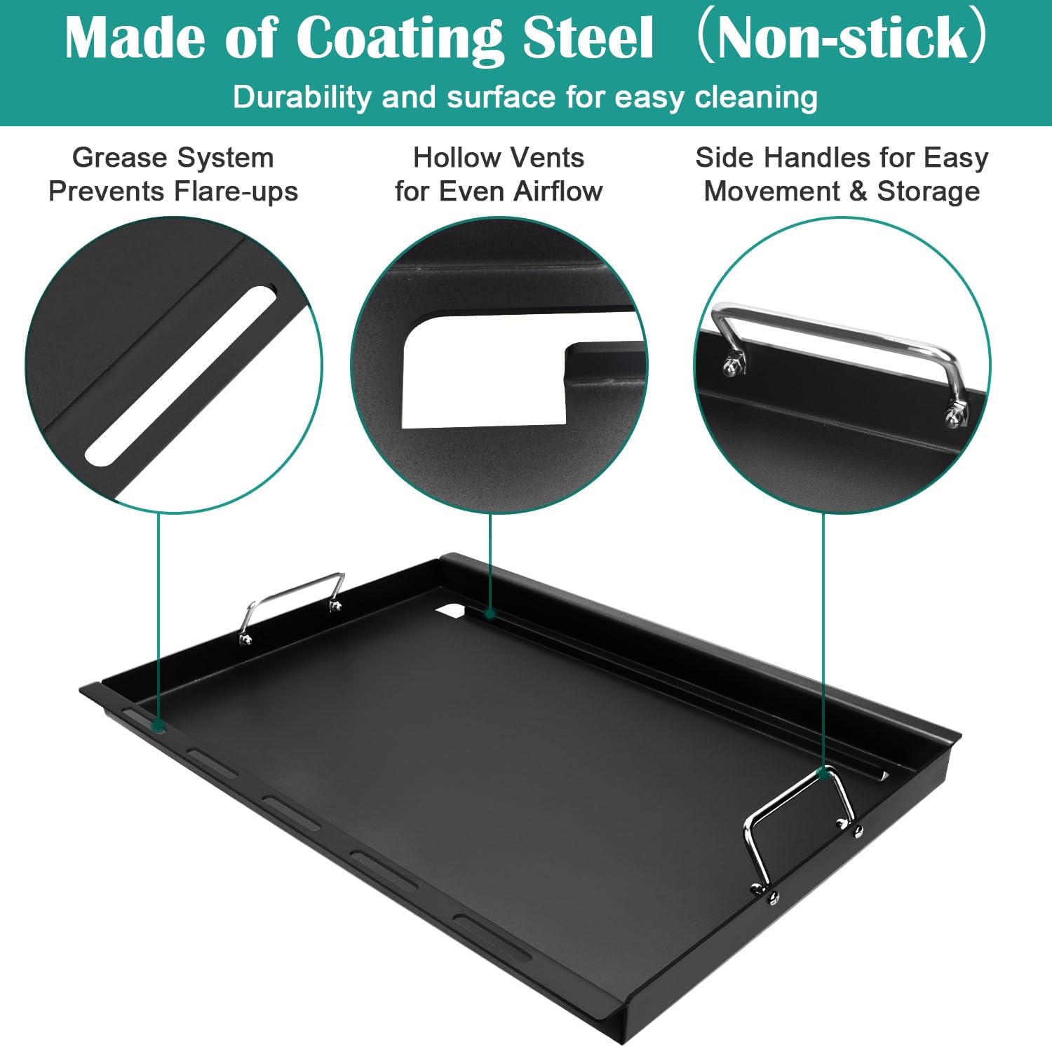 - 【Features】The inserts griddle is closer to the fire source and heats up more easily than other griddles placed on the grates to achieve the temperature needed to cook delicious food. Before use, please remove the grate & emitter plates to achieve closer to the heat source. The surface of the baking pan is made of coating, durable and easy to clean, need to be heated and oiled 1-2 times before use for better results.