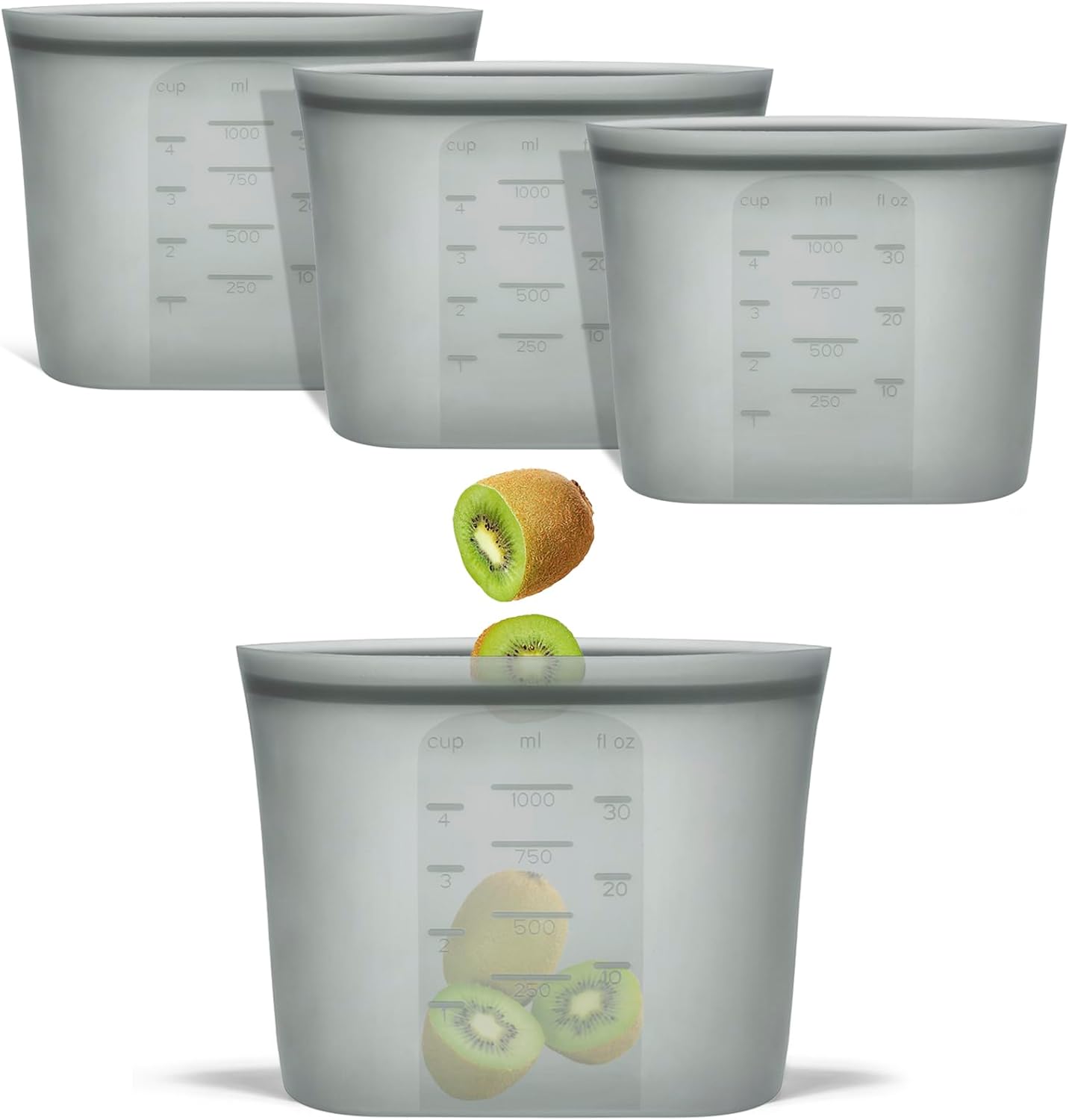 - 【THOUGHTFUL & ECONOMICAL】Small size: 33.8fl.oz/1000ml. These reusabe sandwich bags come with clearly volume marks in cups, milliliters and fluid ounces for easy use. The translucent grey body helps to get a glimpse of what's inside, though not in crystal clear detail. Plus, One silicone bag can reduce up to 300+ single-use plastic bags a year, helping to create a waste-free world and save you a bundle