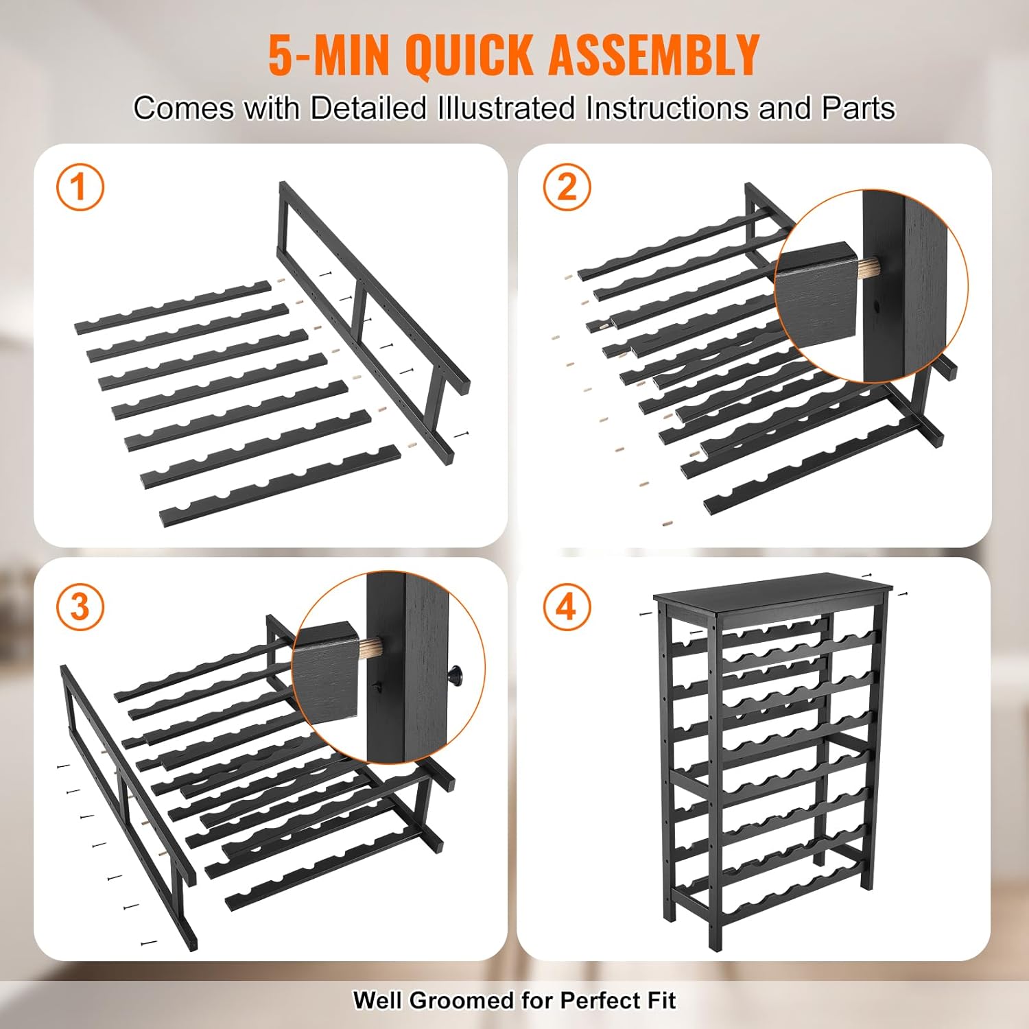 - Hassle-Free Assembly: Assembling our freestanding wine rack is a breeze. Simply follow the easy instructions to tighten the screws, and you can set up the rack immediately. If you need to move the rack, be sure to remove the bottles first.
