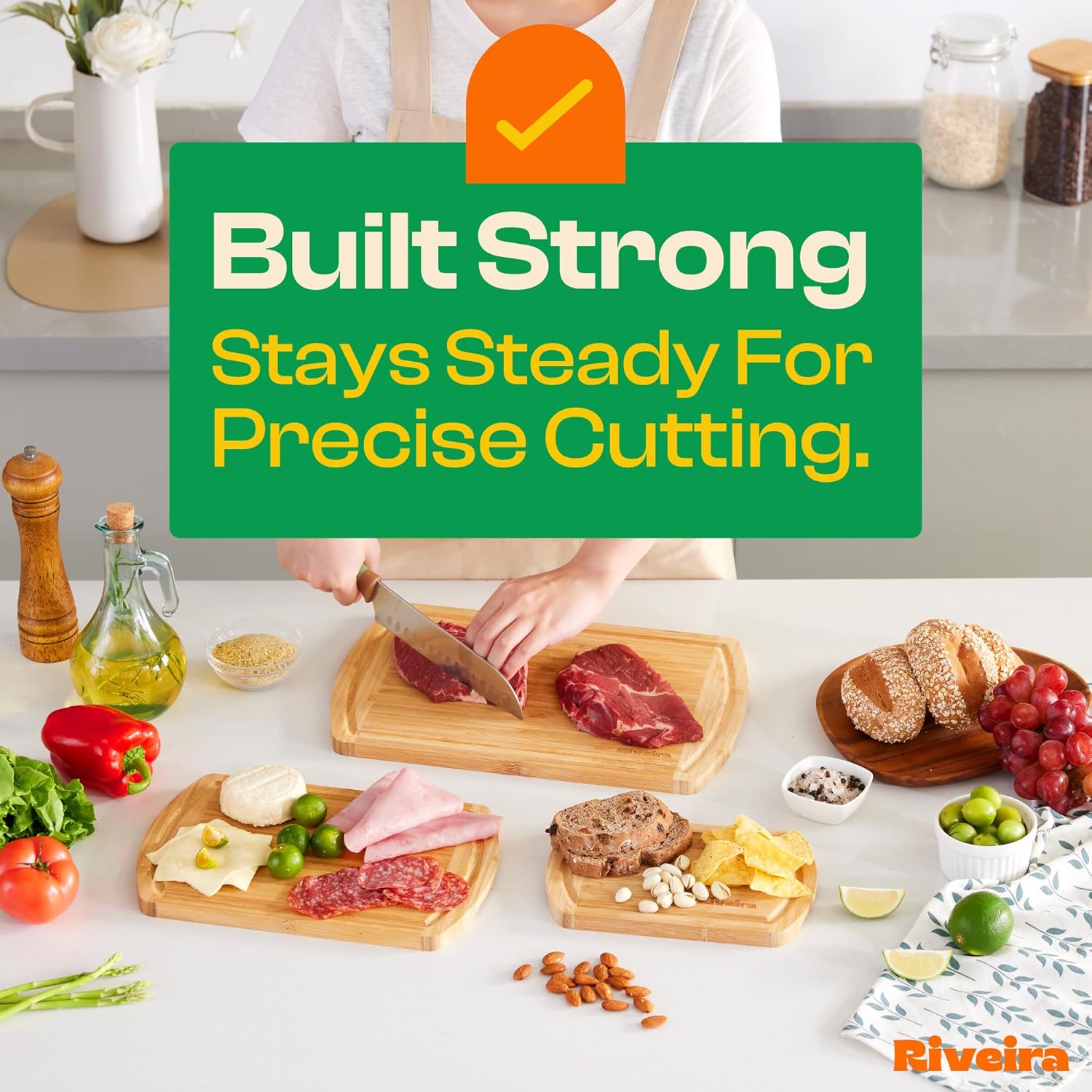 - Premium Crafted bamboo — Take a detour from traditional kitchen aesthetics with this two tone bamboo wood board crafted from 100% natural bamboo. Beyond being an unconventional and eco-friendly choice, the chopping board wood proudly showcases the environment friendly and organic bamboo. This wood cutting boards for kitchen counter adds an unexpected touch of confidence and style to your once-orderly culinary space. Riviera's wooden chopping boards for kitchen will be there for you.