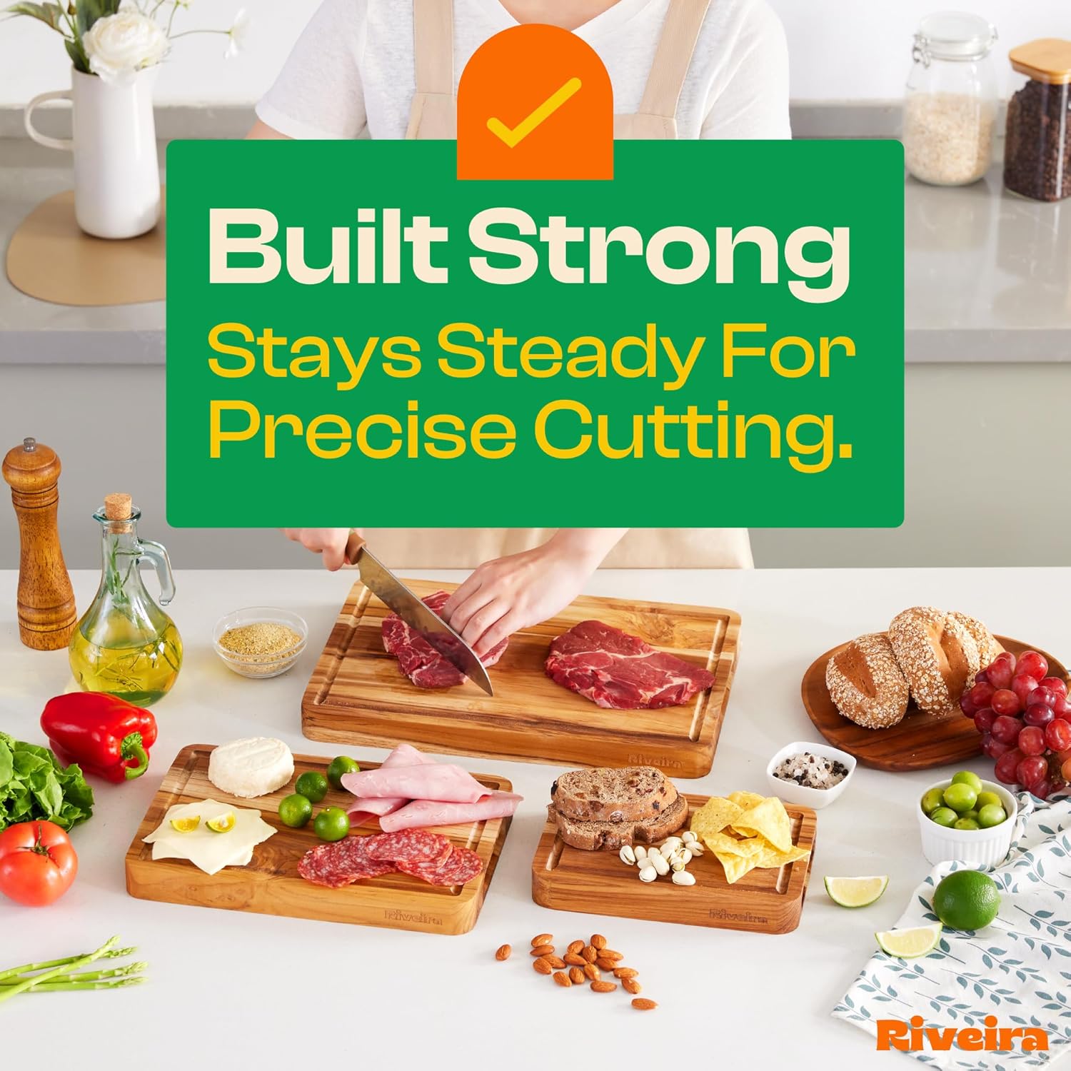- Premium Crafted Teak — Take a detour from traditional kitchen aesthetics with this teak wood board crafted from 100% natural teak. Beyond being an unconventional and eco-friendly choice, the chopping board wood proudly showcases the environment friendly and organic teak. This wood cutting boards for kitchen counter adds an unexpected touch of confidence and style to your once-orderly culinary space. Riviera's wooden chopping boards for kitchen will be there for you for many years to come.