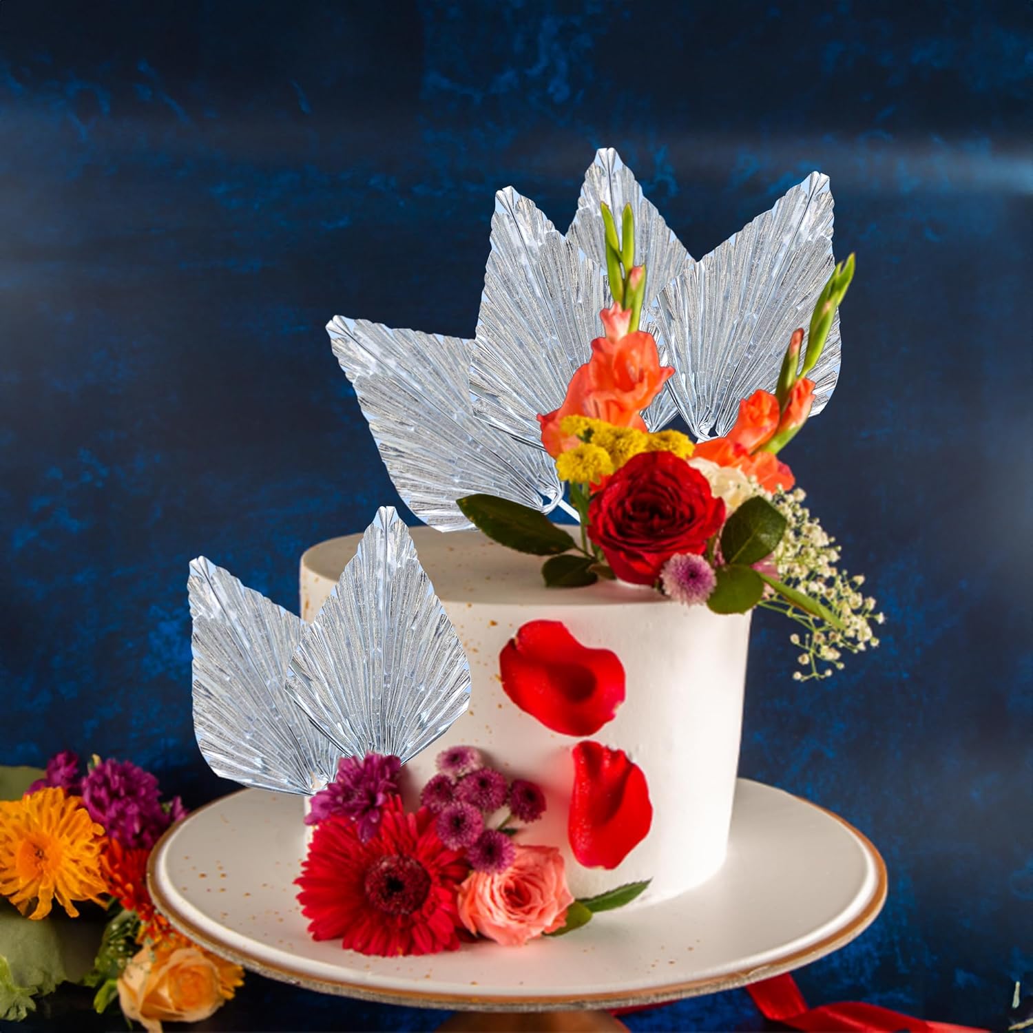 Gyufise 6Pcs Paper Palm Fan Cake Topper Palm Leaf Fan Cake Pick for DIY Bakeware Craft Project Home Made Wedding Bridal Shower Birthday Anniversary Party Cake Decorations Supplies Metallic Silver