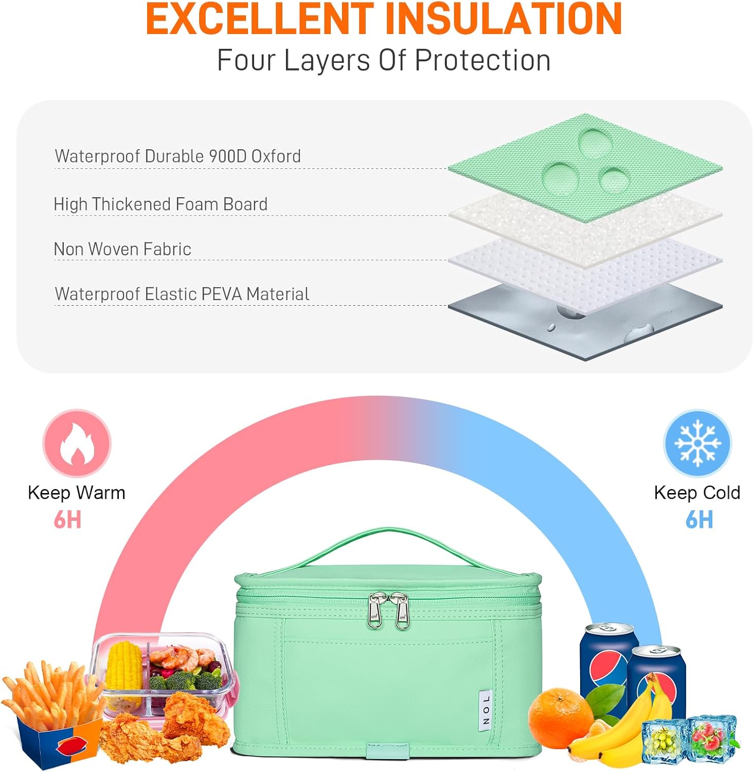 - Premium Material: NOL mini reusable lunch bag is made of the highly quailty 900D Polyester, the inner layer is PEVA material and the middle layer is specially filled with 5mm thick insulating lining, which provide great insulation to keep the food warm or fresh up to 3-4 hours.The double zippers of the thermal bag are made by NOL, very smooth and resistant.